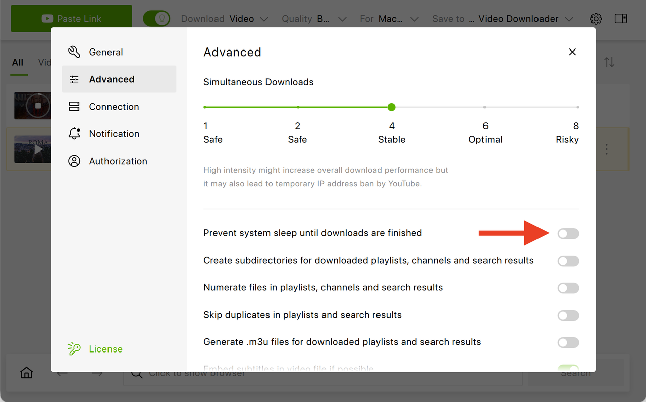 Tip: Considering that downloading a longer video might take longer than usual, this setting in 4K Video Downloader Plus is particularly helpful. To prevent system sleep until the download is finished, simply toggle this setting on (Settings -> Advanced -> Prevent system sleep until downloads are finished).