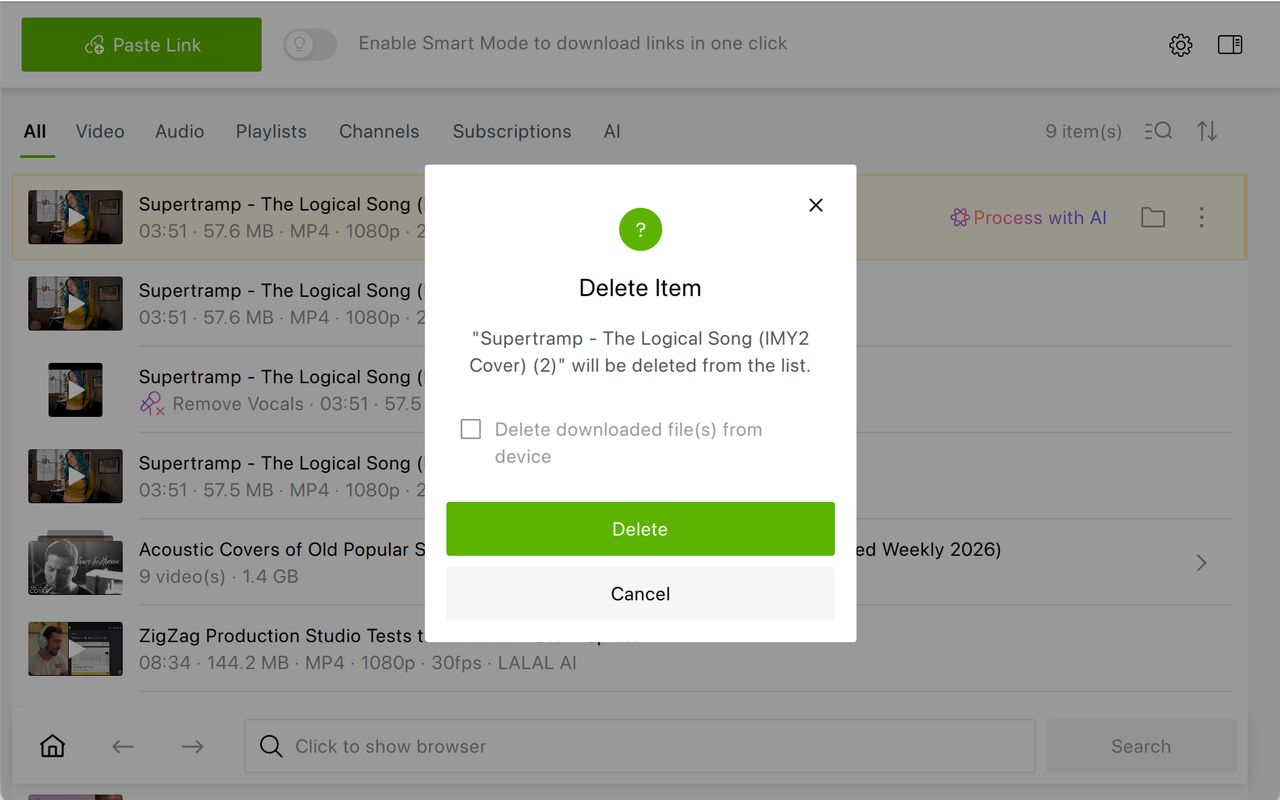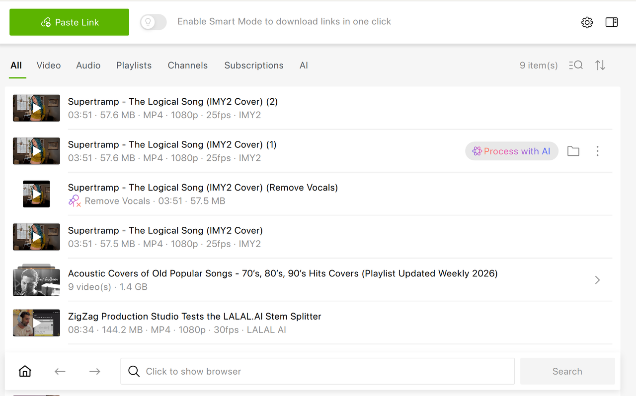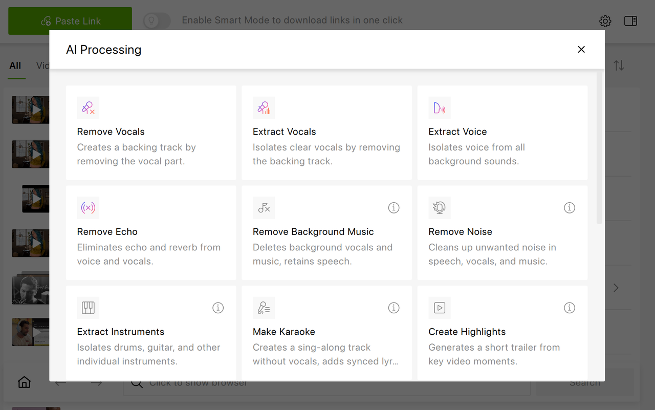 You can now process audio and video directly inside the app using the "Process with AI" button available next to any downloaded file. There's no need to export files to external editors: everything happens in the same workspace where you manage your downloads.
