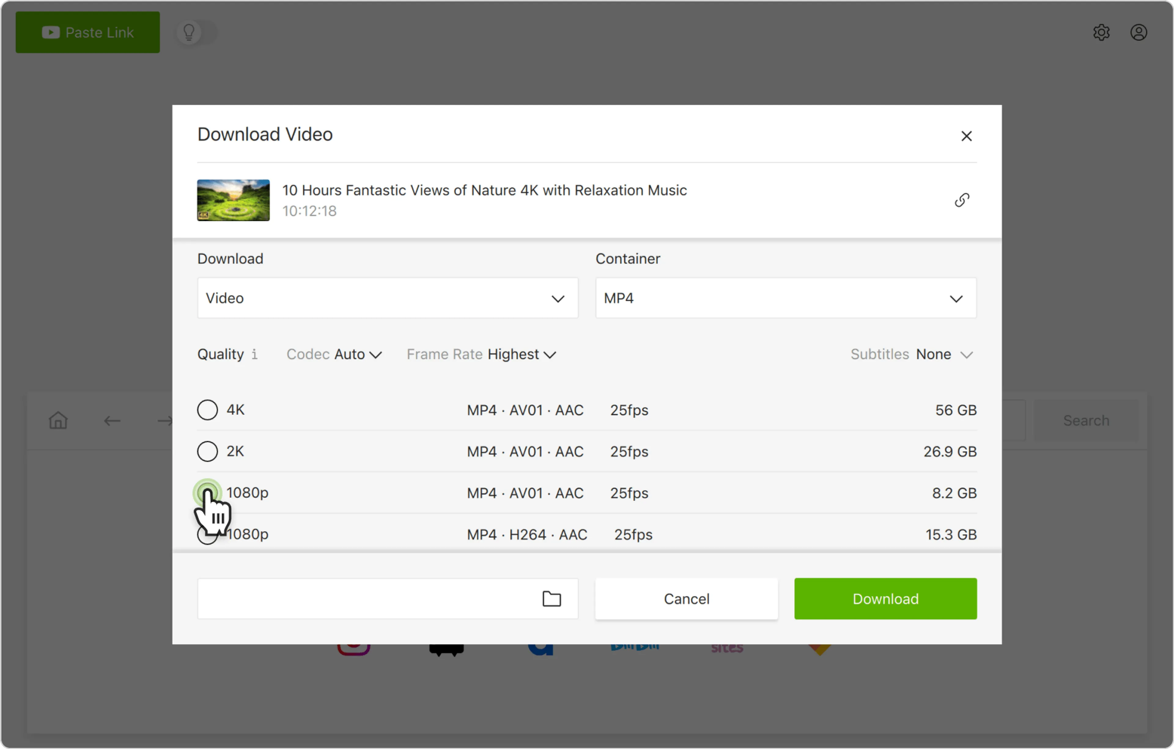 2. Wählen Sie die Download-Parameter aus. Tippen Sie auf das Einstellungssymbol in der Symbolleiste und wählen Sie das Format, die HD-Qualität (1080p) oder höher und den Zielordner aus.