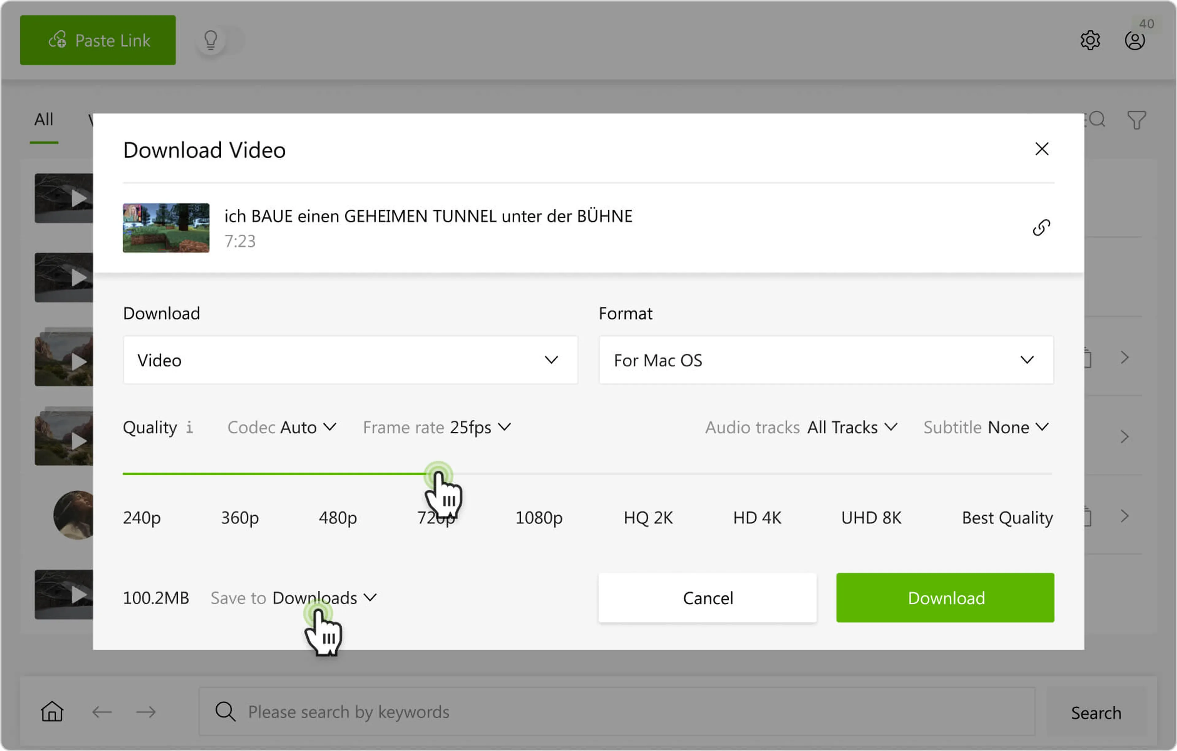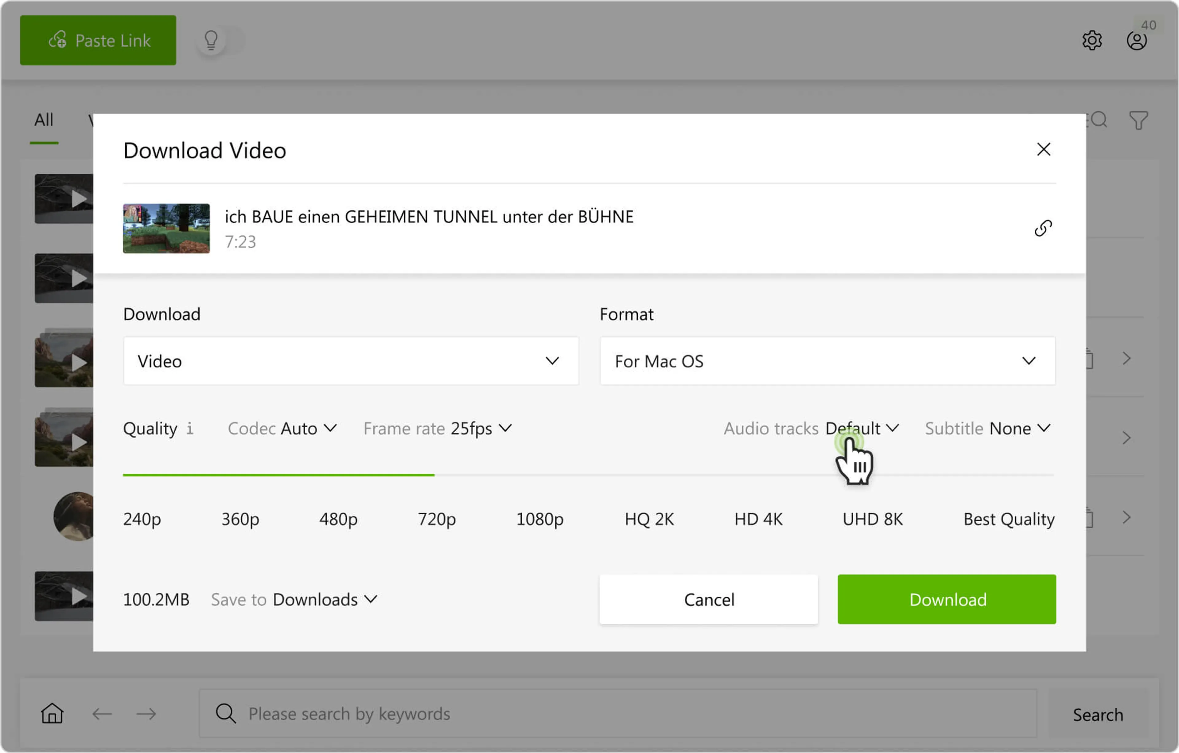 En el modo manual 4K Video Downloader Plus te permite descargar pistas de audio dobladas de YouTube con la mayor flexibilidad. A diferencia del Modo inteligente, que aplica automáticamente los mismos ajustes a todos los enlaces, el modo manual te permite seleccionar de la lista de pistas dobladas disponibles cada vez que pegas un enlace a un video de YouTube.