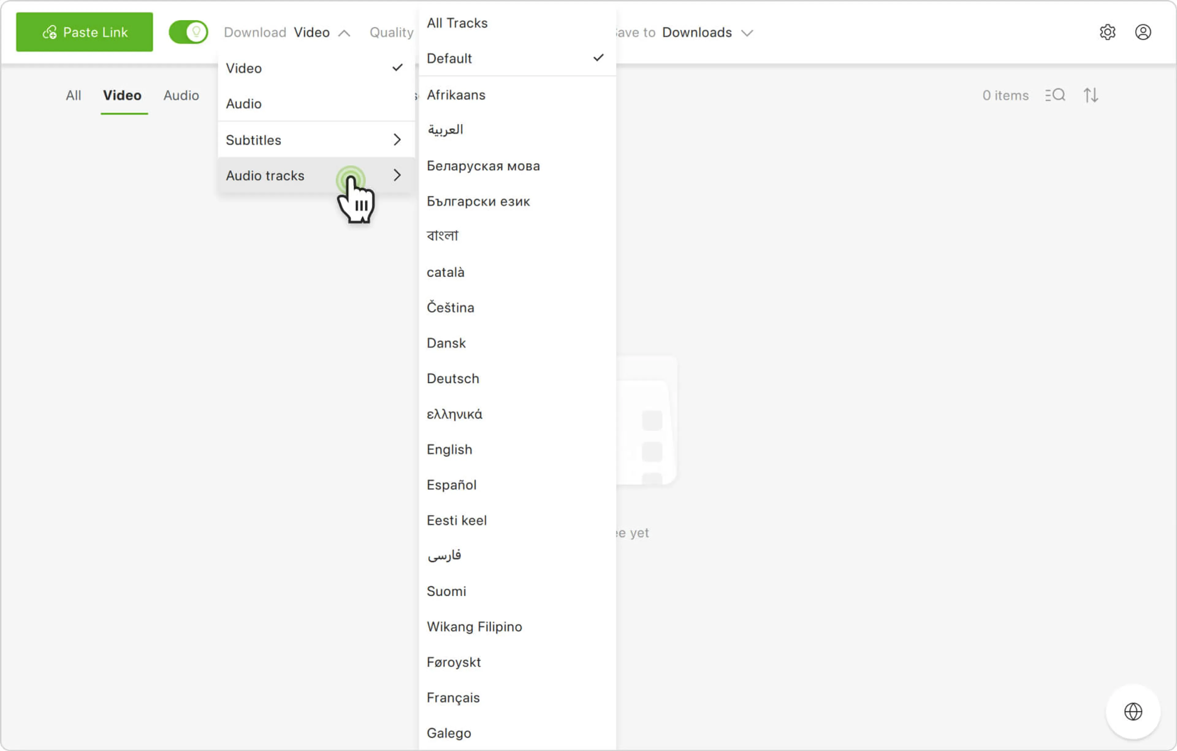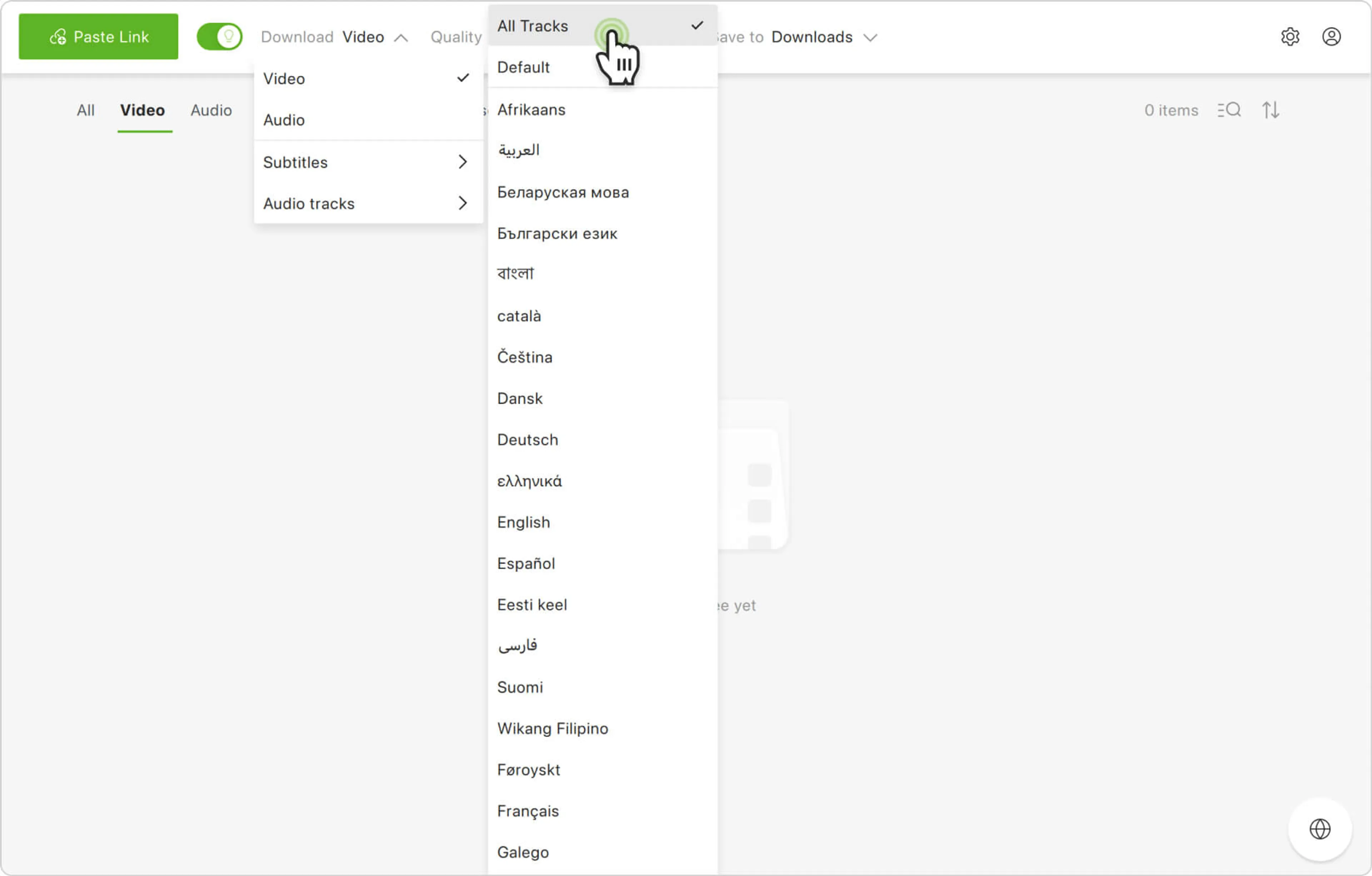 5. En la lista desplegable, haz clic en las pistas de audio dobladas que deseas descargar junto con el video. Alternativamente, puedes descargar todas las pistas de audio disponibles haciendo clic en Todas las pistas en la parte superior de la lista.