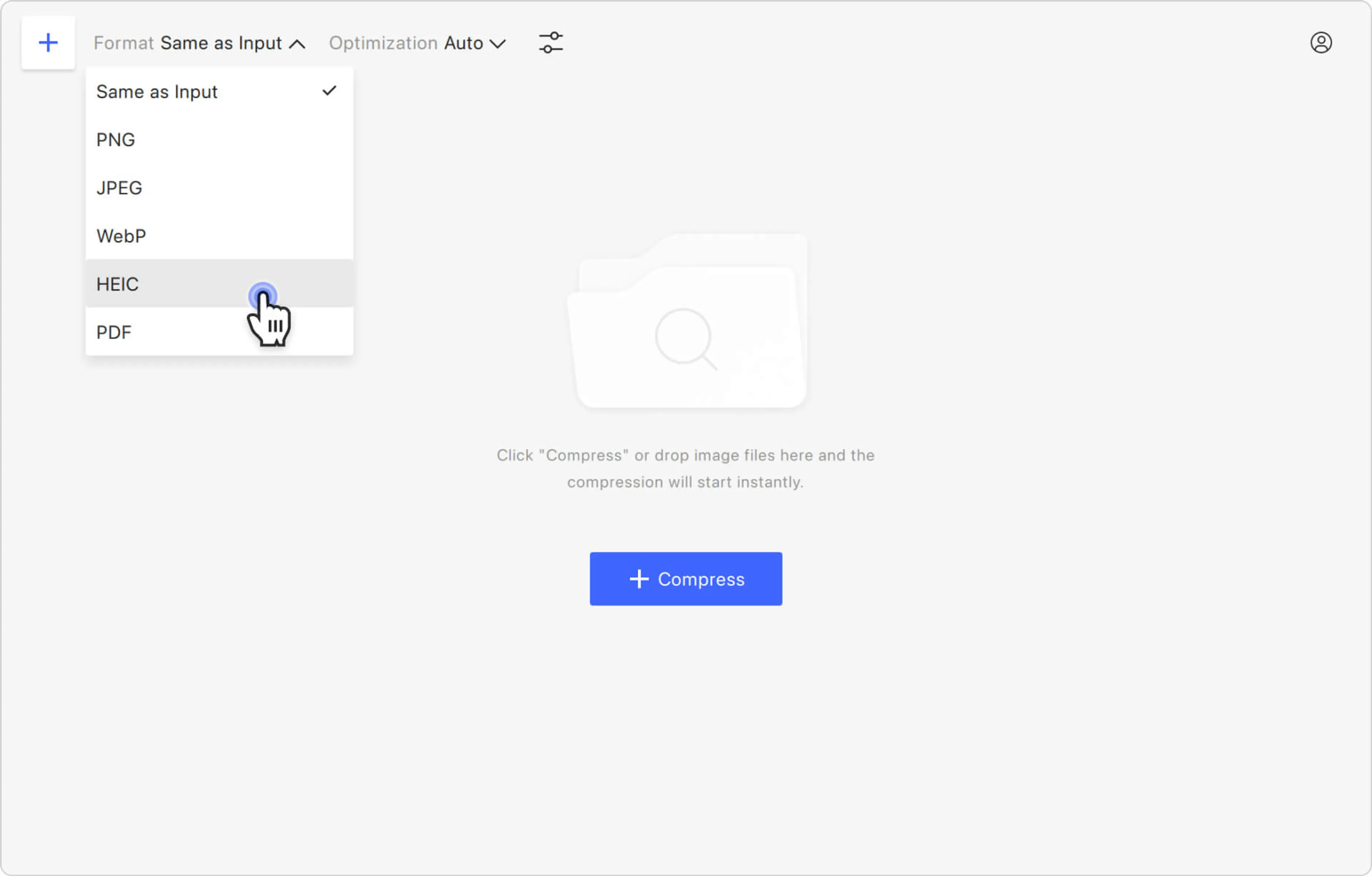 6. Sube tu imagen. Pulsa el botón Comprimir en el parte central de la ventana de la aplicación para seleccionar el archivo, o solo arrastra y suelta la imagen. Tu HEIC se cargará y reducirá de inmediato.