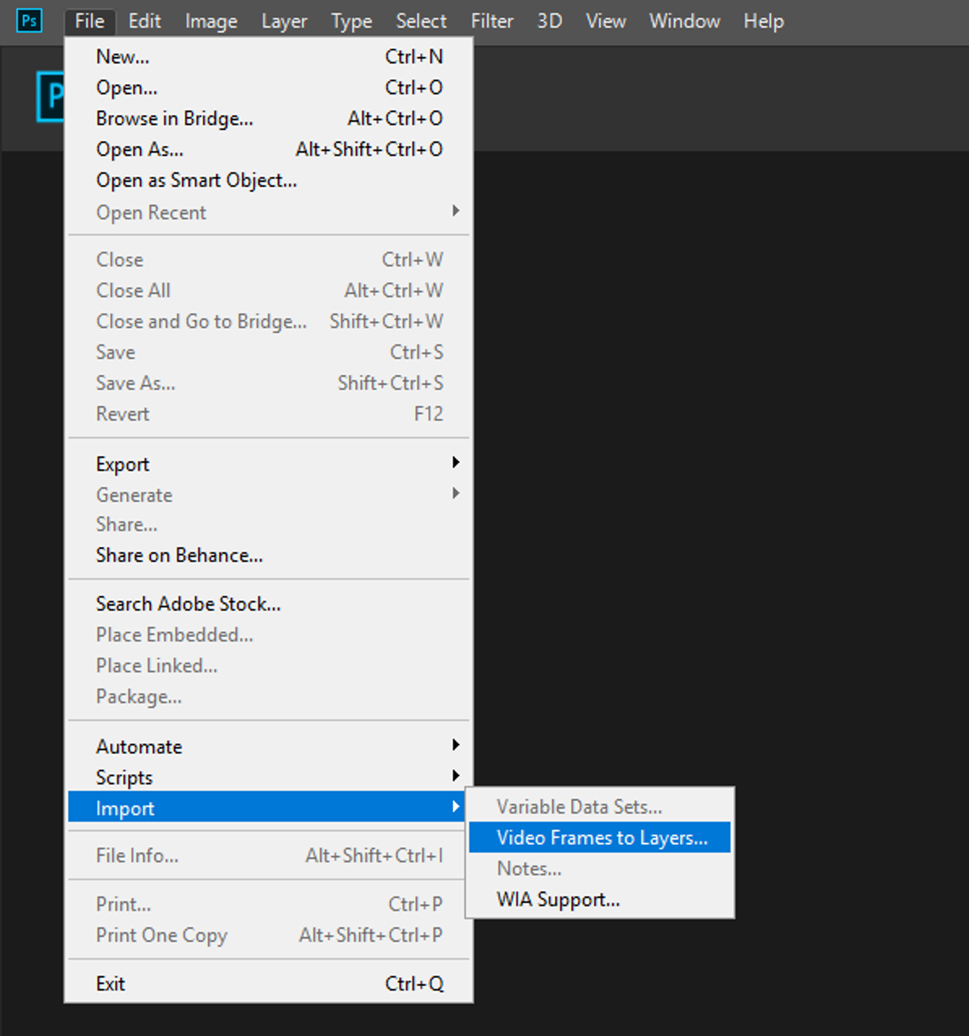 2. Placez le curseur sur Importation et sélectionnez l'option Images vidéo dans des calques.