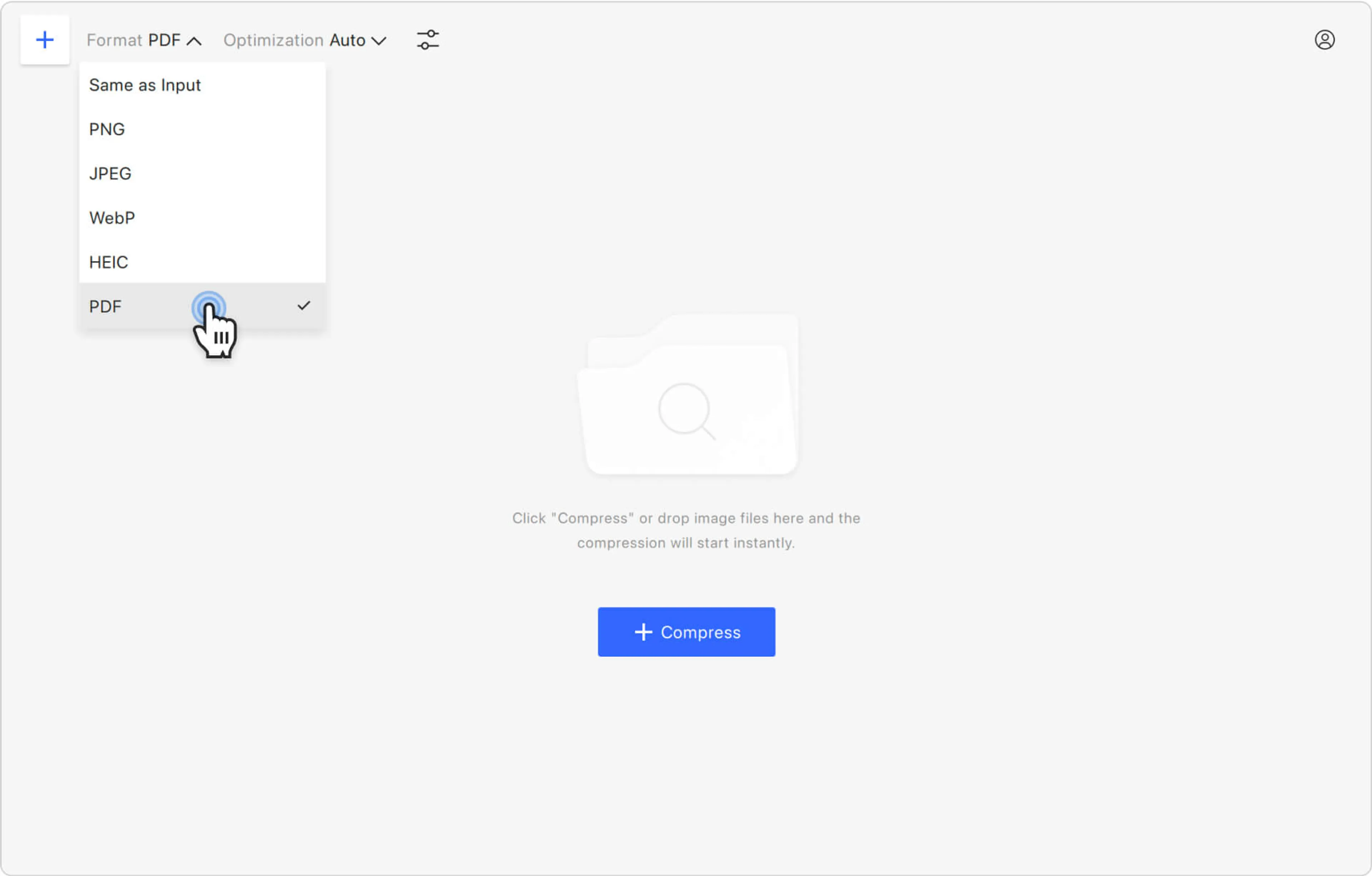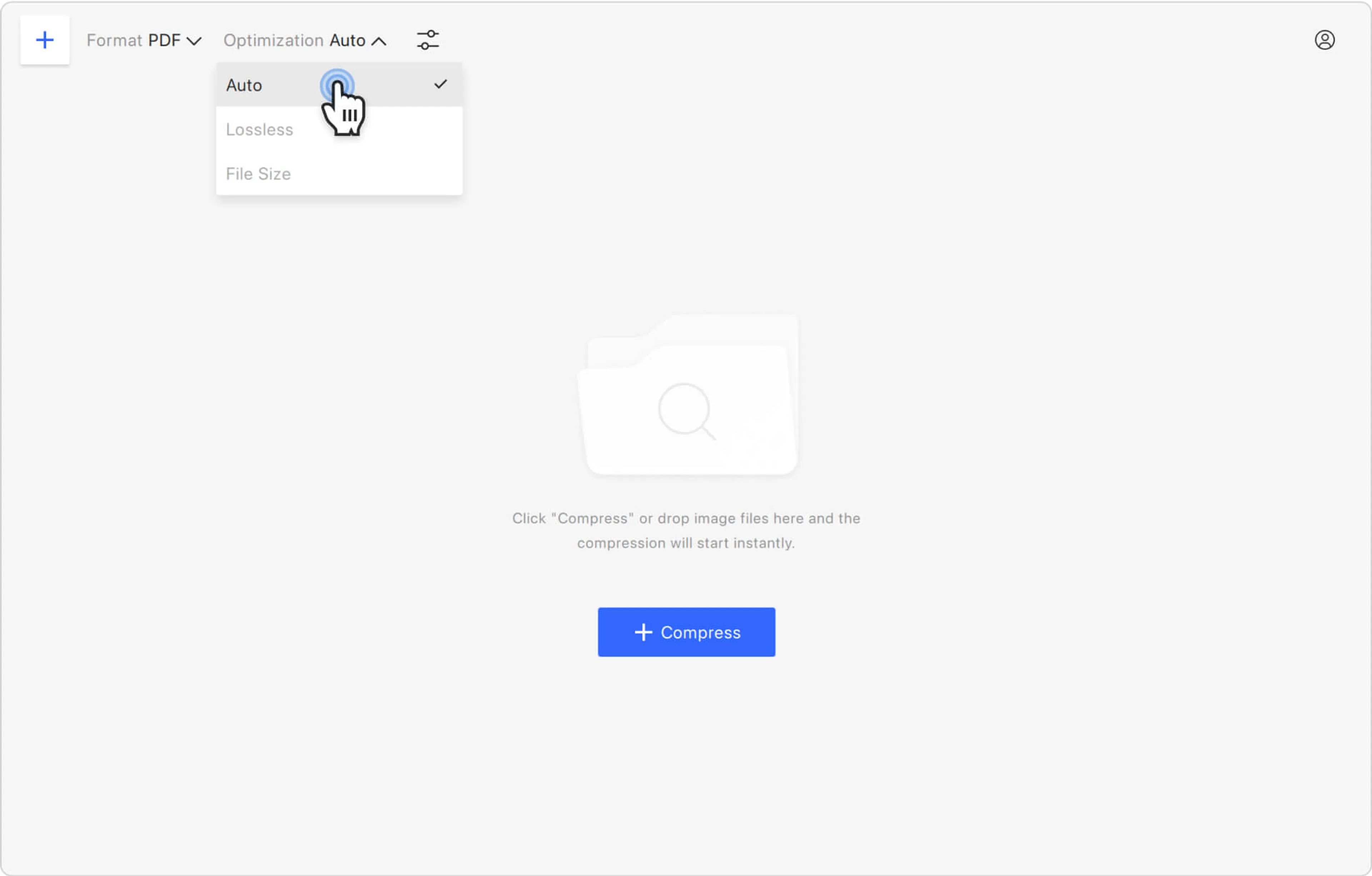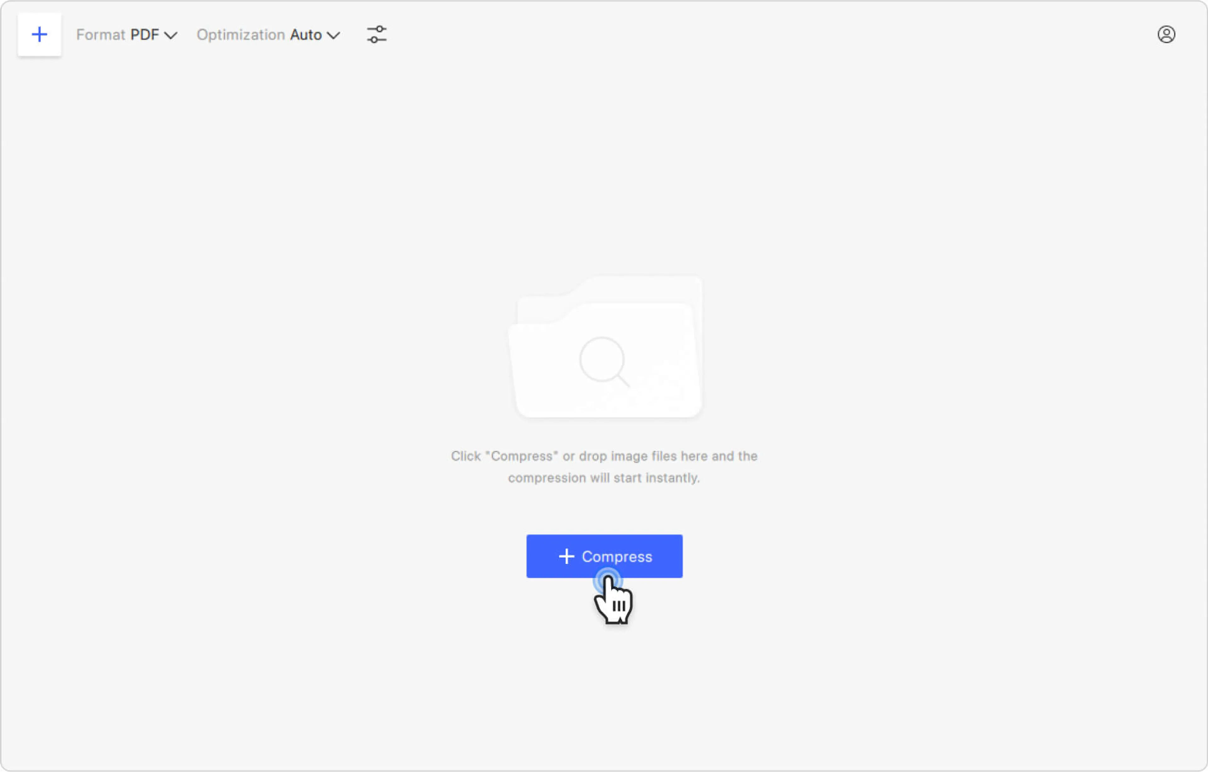 5. Ajoutez votre fichier. Cliquez sur le bouton Compresser au milieu de la fenêtre de l'application pour sélectionner le fichier, ou faites simplement glisser l'image. Votre PDF sera immédiatement téléchargé et compressé.