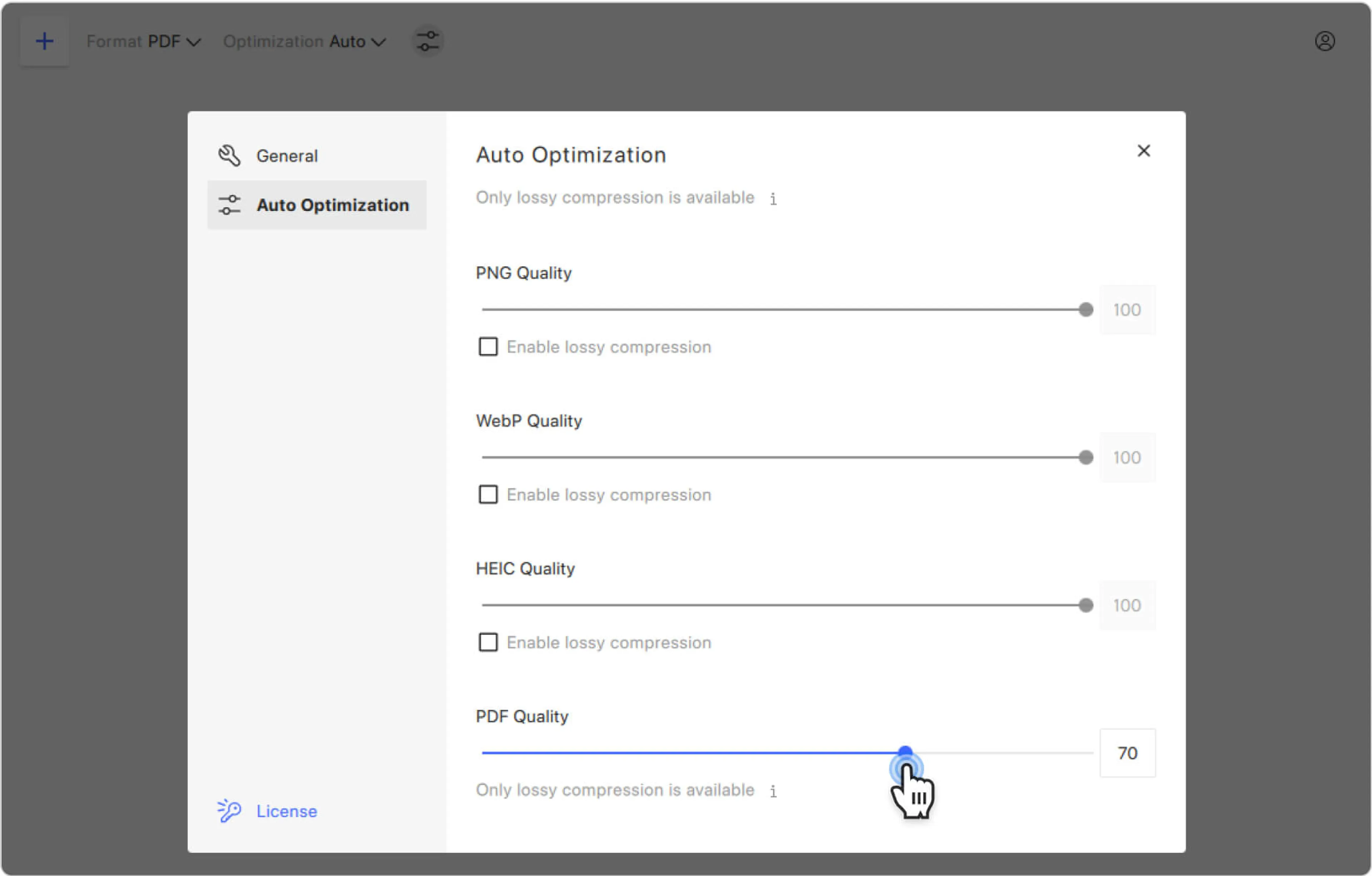 Dans la fenêtre ouverte, sélectionnez l'un des préréglages d' Auto-optimisation activez le mode Manuel. Si vous avez fait la dernière action, déplacez le curseur Qualité PDF en fonction de vos préférences.