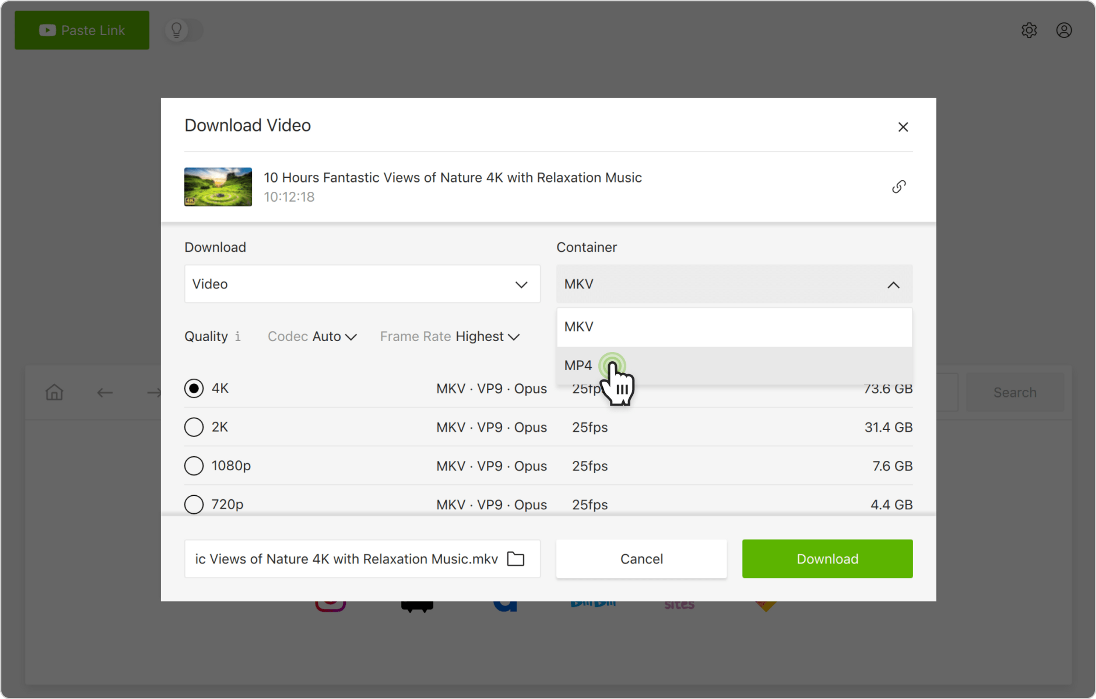 MP4 est un format vidéo largement pris en charge par la plupart des lecteurs multimédias, des dispositifs et des systèmes d'exploitation. Il utilise une technologie de compression avancée qui permet de produire des vidéos de haute qualité dans des fichiers de taille réduite. Cela facilite le stockage et le partage des vidéos sans compromettre la qualité. Si vous souhaitez télécharger des vidéos YouTube au format MP4, 4K Video Downloader Plus est exactement ce qu'il vous faut. Suivez les étapes simples ci-dessous pour lancer le téléchargement.
