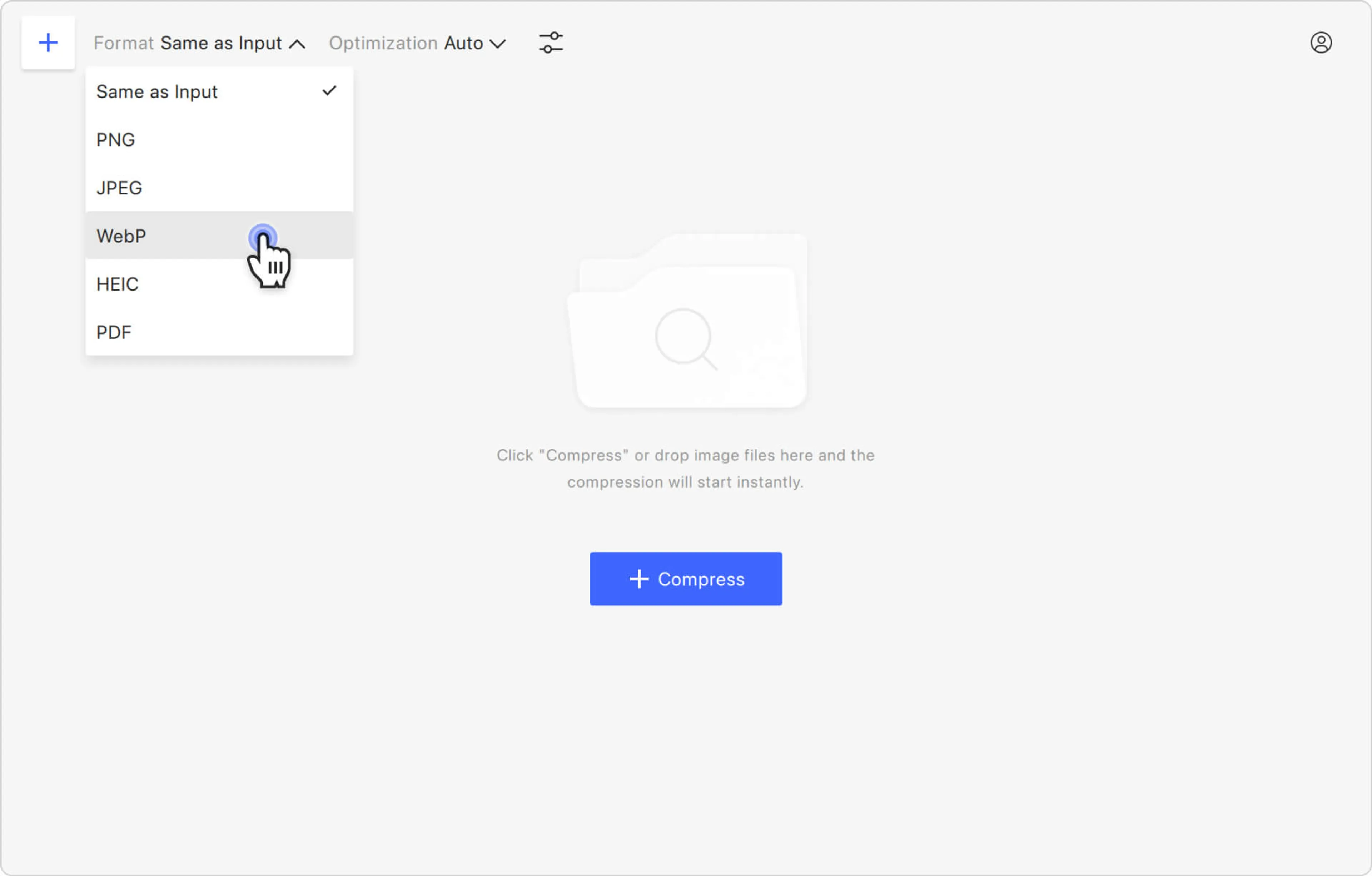 6. Carica la tua immagine. Clicca sul pulsante Comprimere al centro della finestra dell'applicazione per selezionare il file, oppure trascina e rilascia semplicemente l'immagine. La tua immagine WEBP verrà immediatamente caricata e compressa.