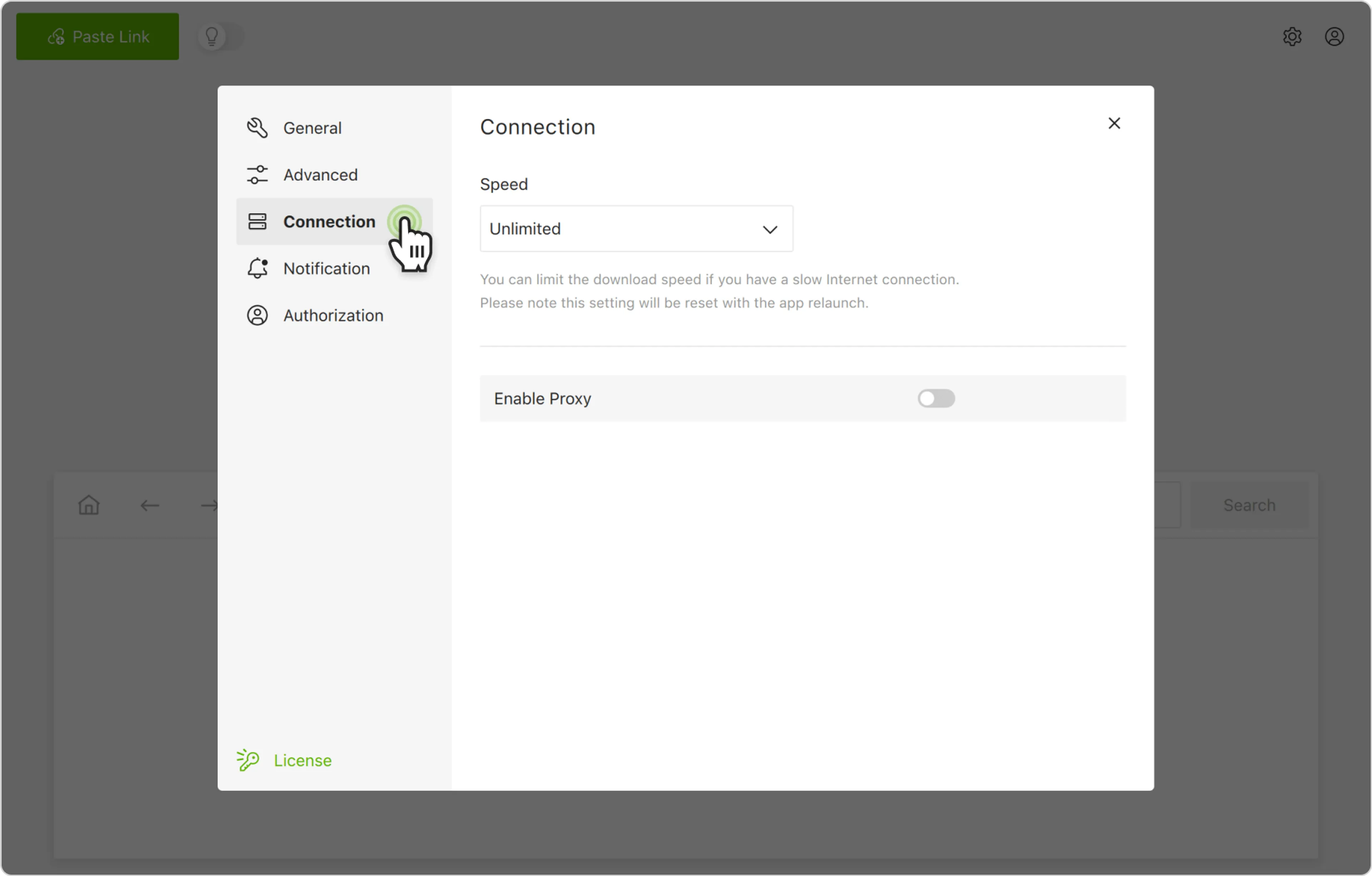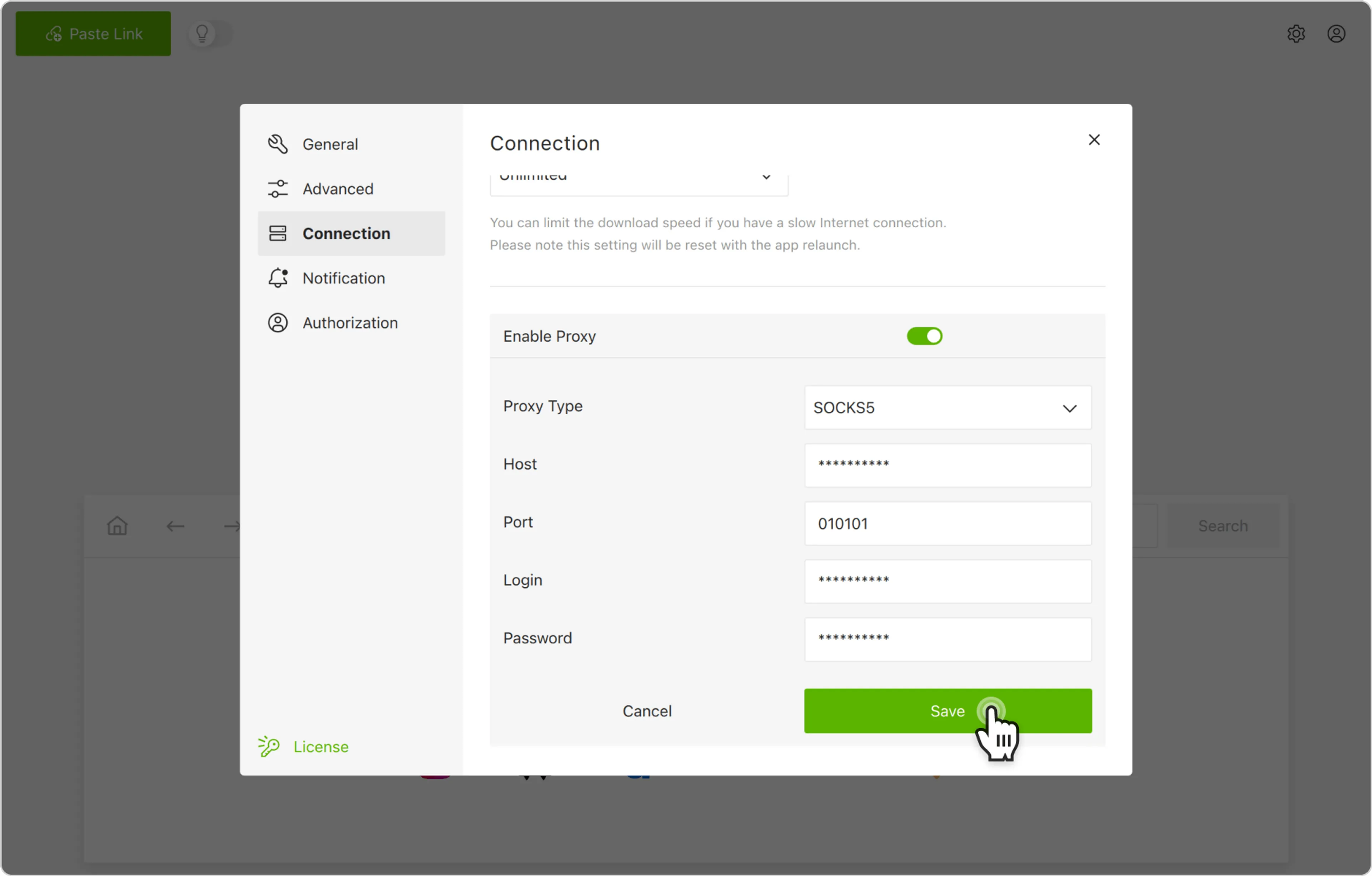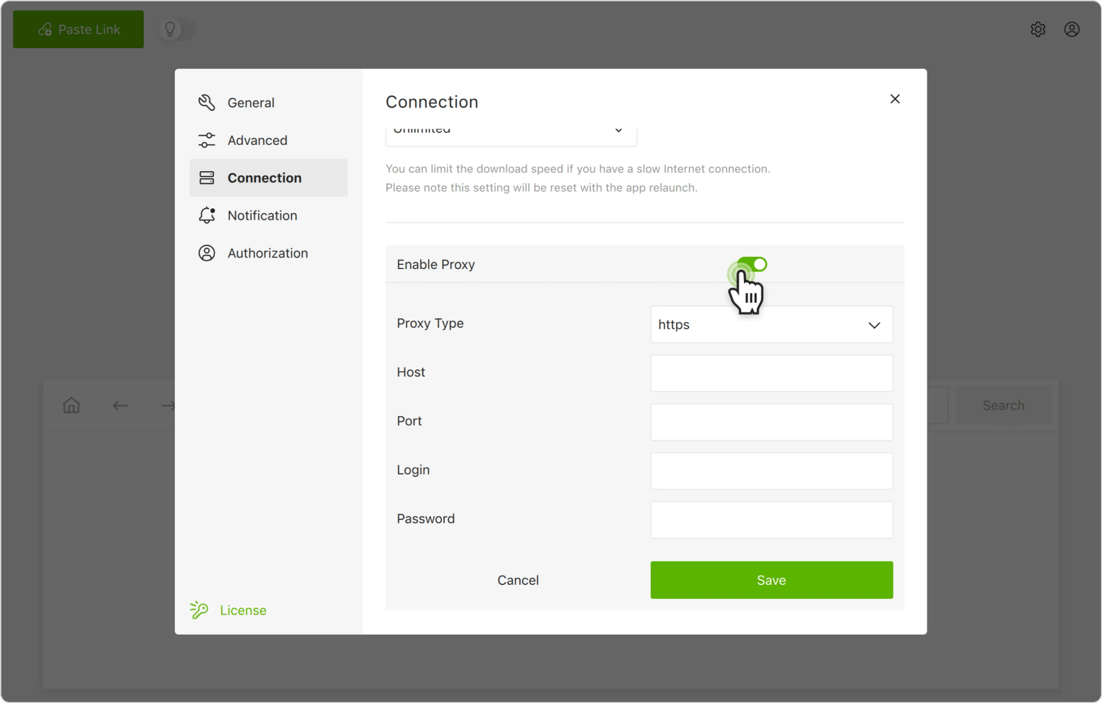 3. Apri la scheda Connessione, quindi attivare l'interruttore accanto a Abilita proxy. La finestra si espanderà con una sezione di impostazioni proxy.