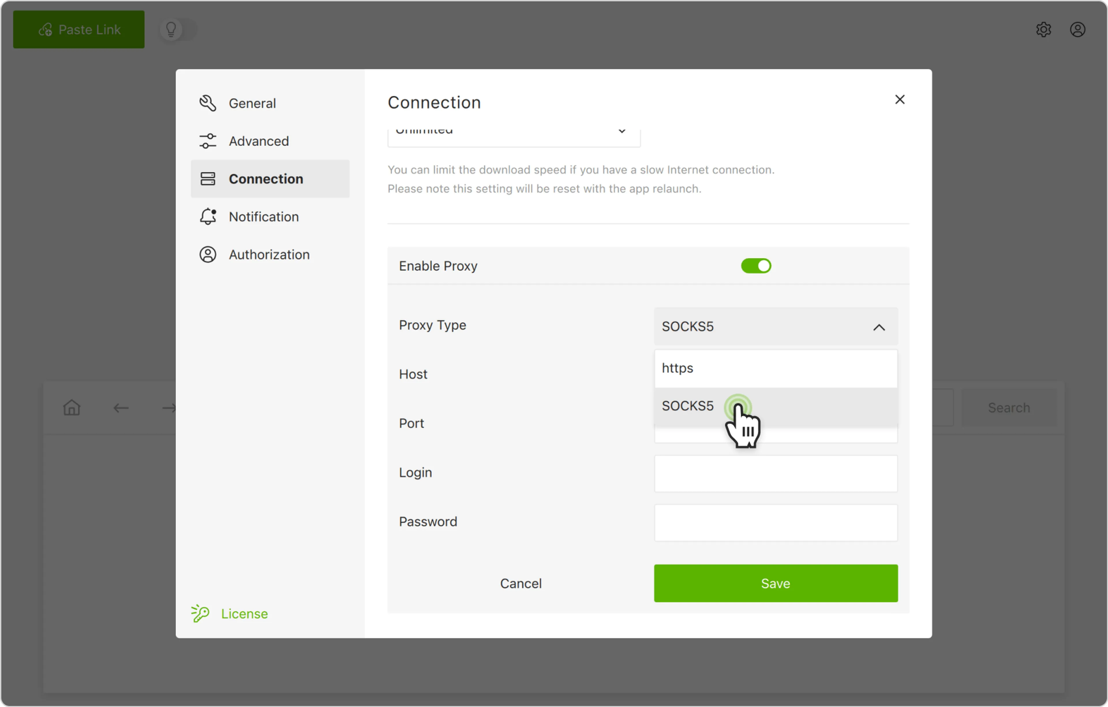 4. Seleziona il tipo di proxy. Può essere https o SOCKS5.