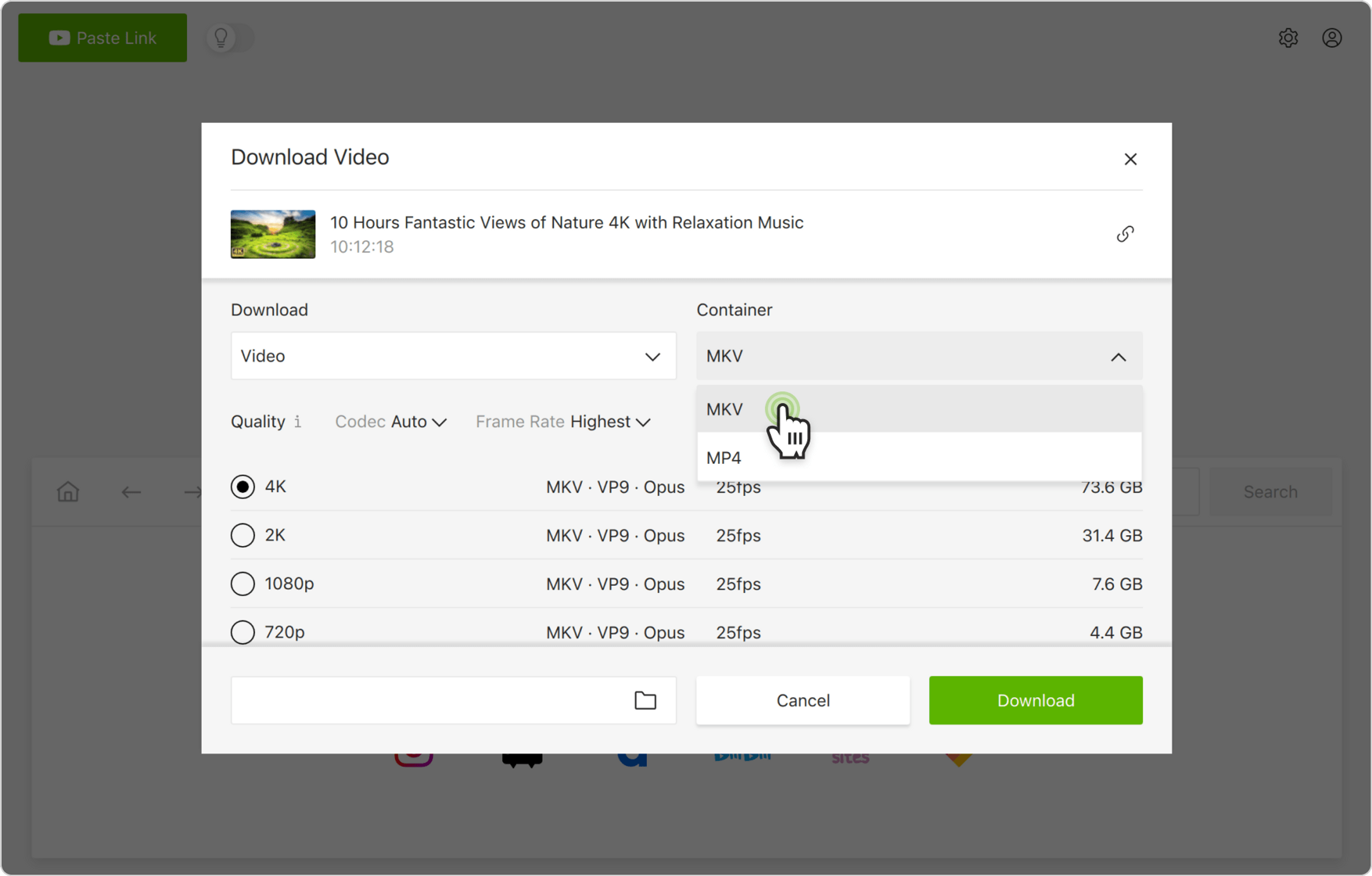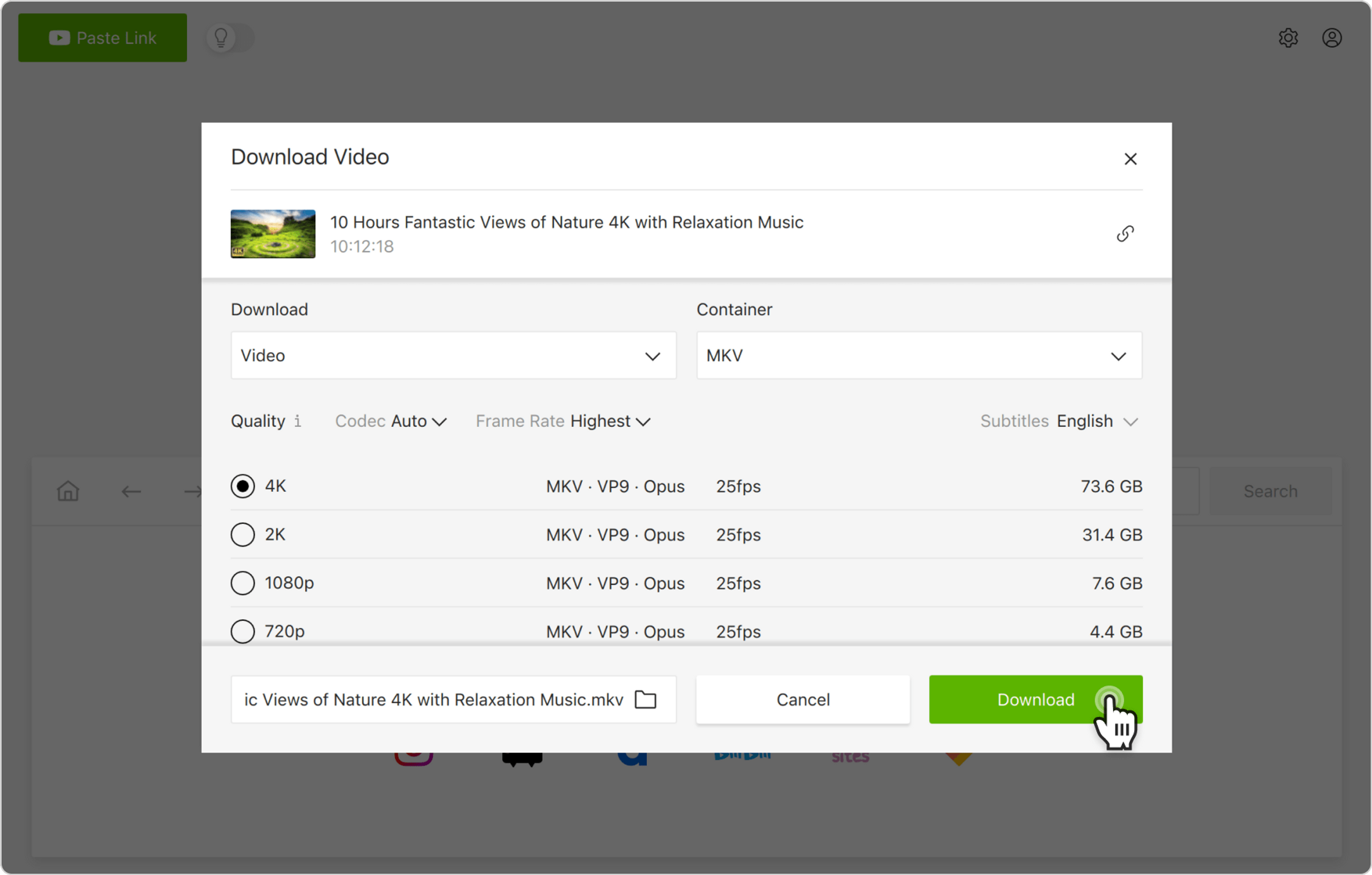 MKV形式は高画質のビデオやオーディオコーデックをサポートしているため、高解像度ビデオコンテンツを保存するための推奨形式となっています。YouTubeからMKV形式で動画をダウンロードしたい場合は、4K Video Downloader Plusが最適です。ダウンロードを開始するには、以下の簡単な手順に従ってください。