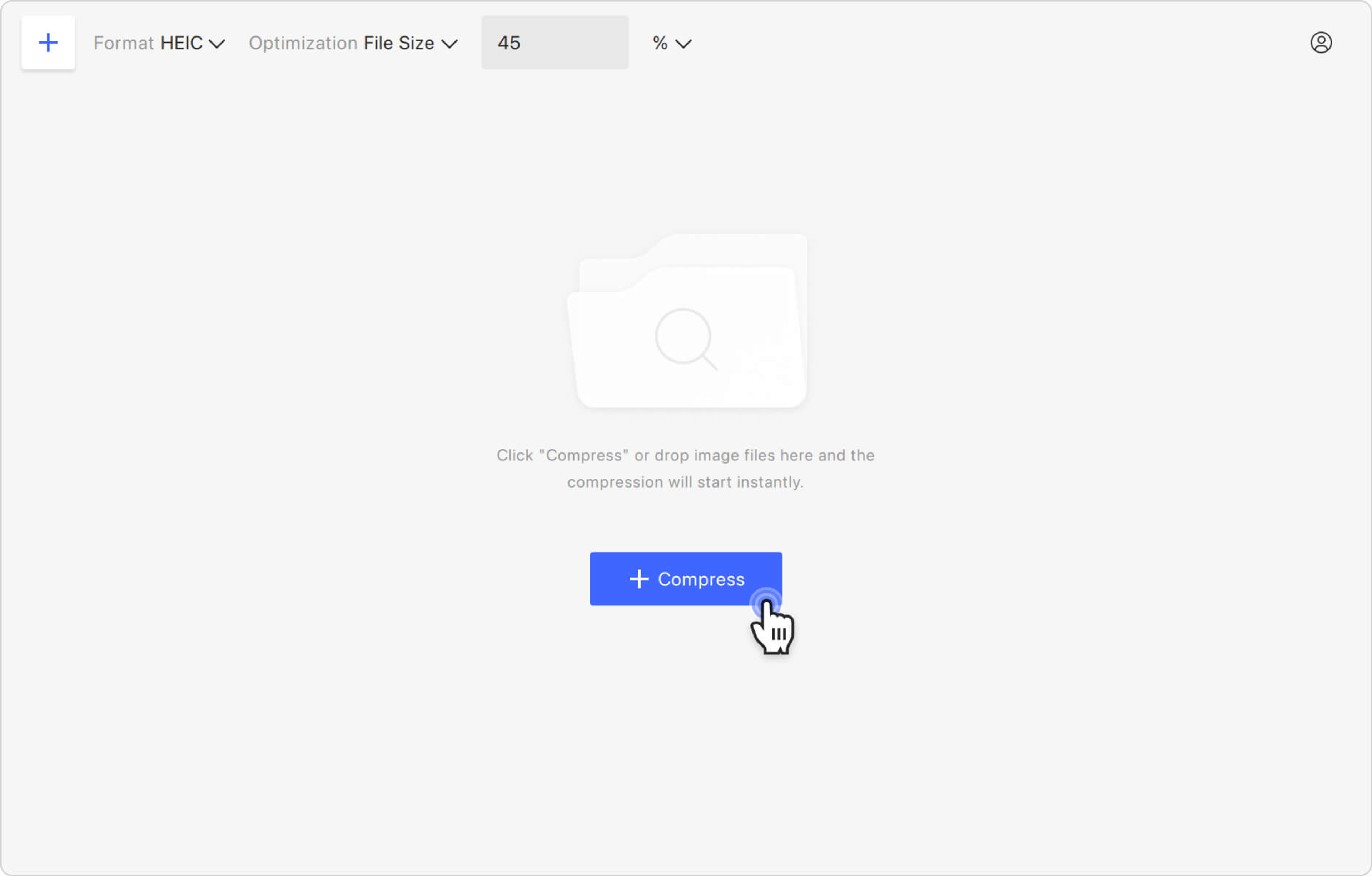 6. 이미지를 업로드하세요. 애플리케이션 창 중앙에 있는 압축 버튼을 클릭하여 파일을 선택하거나 이미지를 드래그 앤 드롭하세요. HEIC 즉시 업로드되고 압축됩니다.