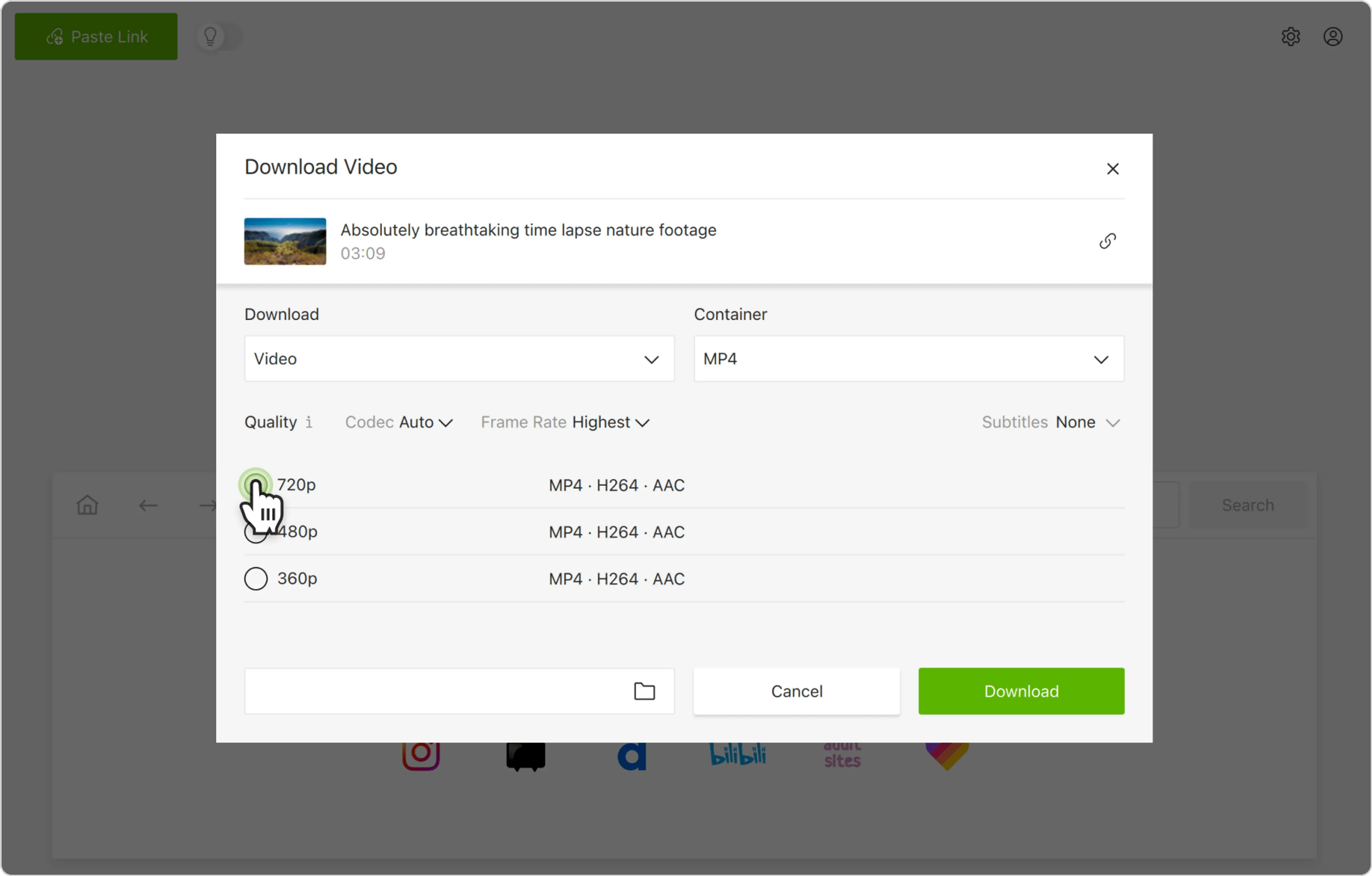 또는 인앱 브라우저를 통해 Rumble 비디오를 찾아 다운로드할 수 있습니다. 이렇게 하면 애플리케이션을 종료하지 않고 Rumble을 탐색하고 그 자리에서 콘텐츠를 다운로드할 수 있습니다.