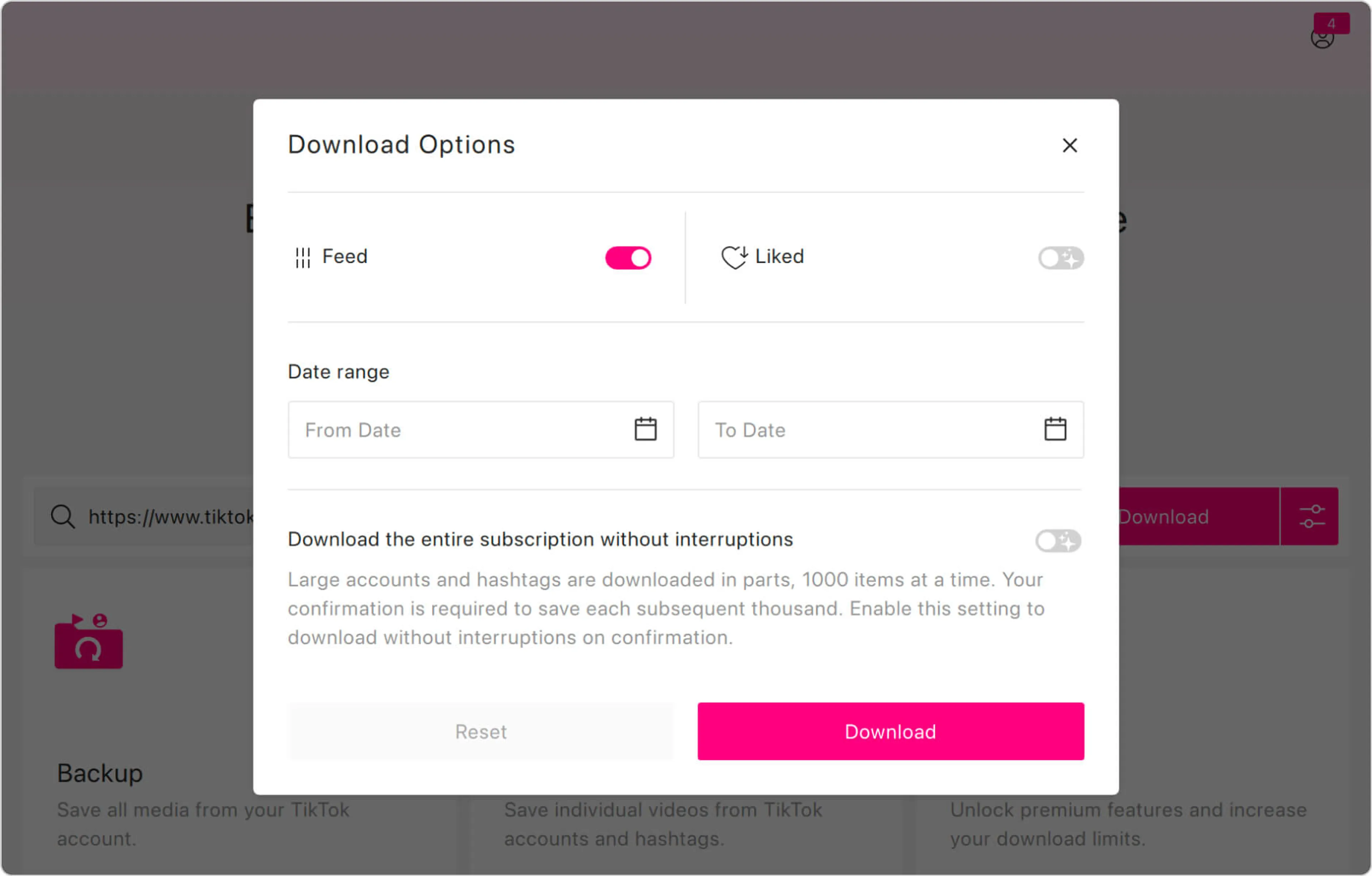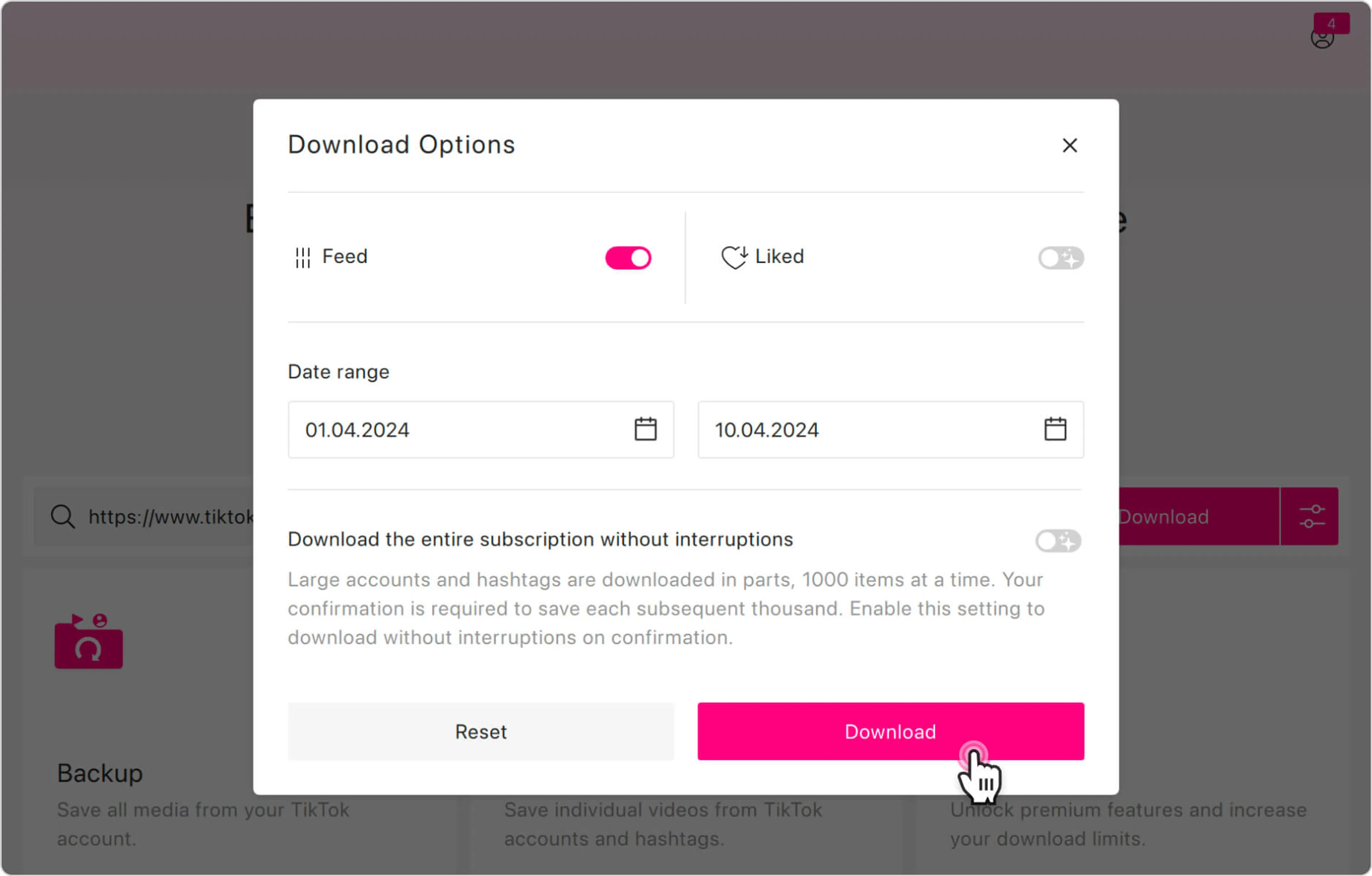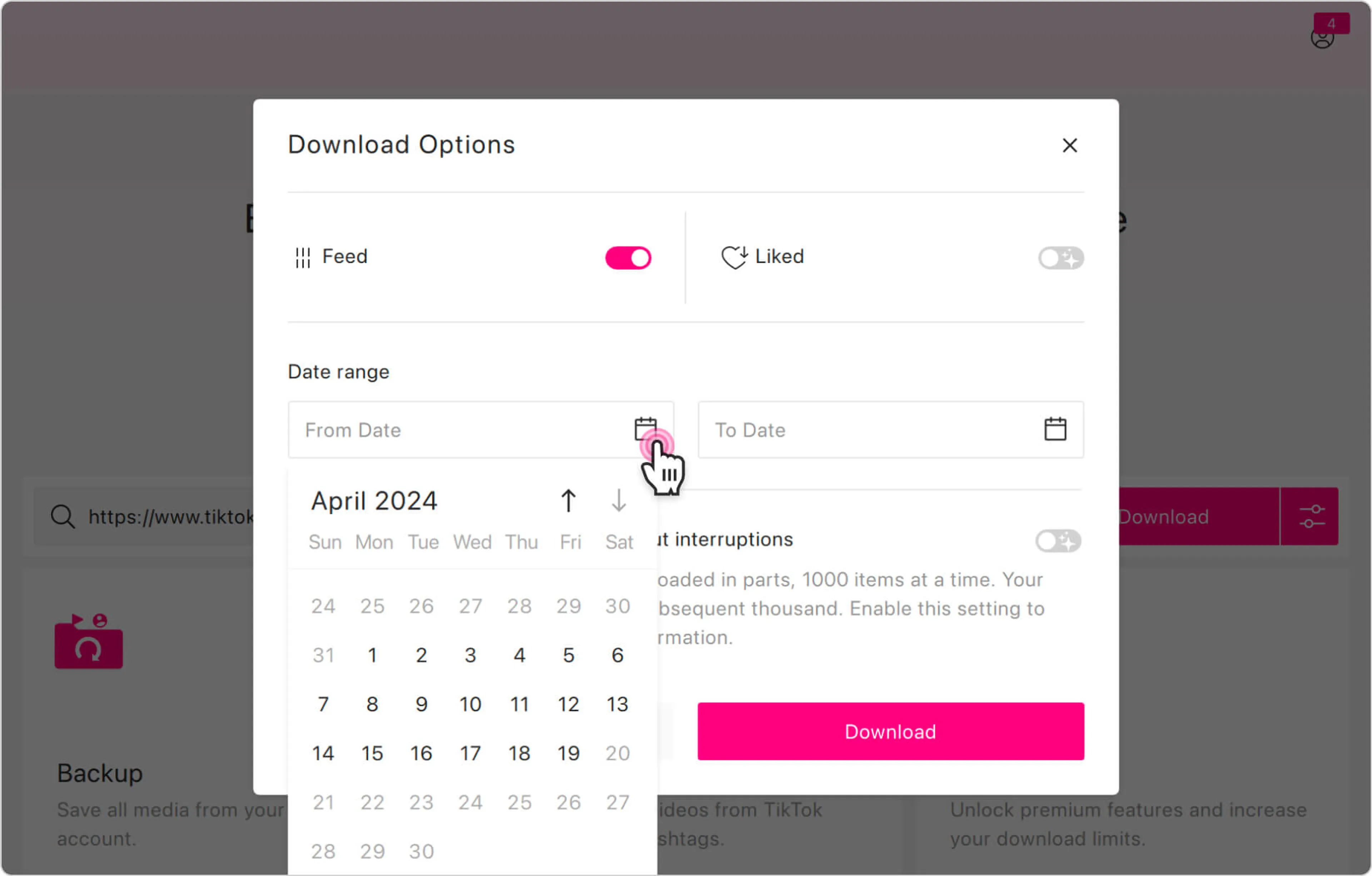 Tip: Je kunt ook alleen video's downloaden die op een specifieke datum of binnen een specifieke periode zijn gepost. Klik op het icoon voor instellingen rechts naast de knop Download. Open de kalender binnen de app en stel de gewenste datum of tijd in. Let op dat de periodeselectie alleen werkt bij het downloaden van TikTok accounts.