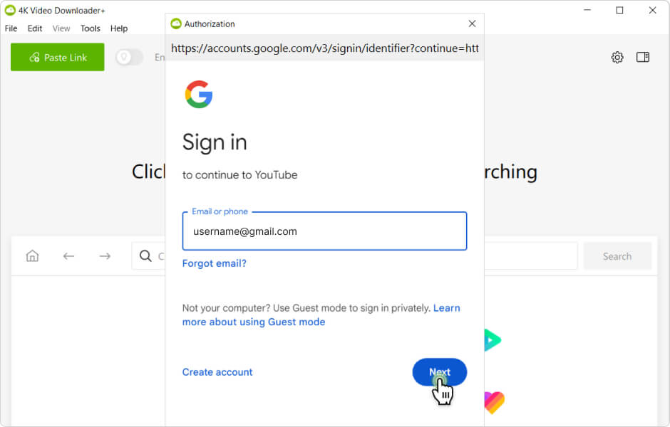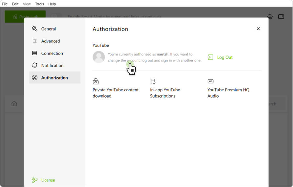 Os aplicativos 4K Video Downloader Plus e 4K YouTube to MP3 suportam o recurso de autorização ao YouTube dentro do aplicativo. Usuários logados podem realizar as seguintes ações exclusivas: