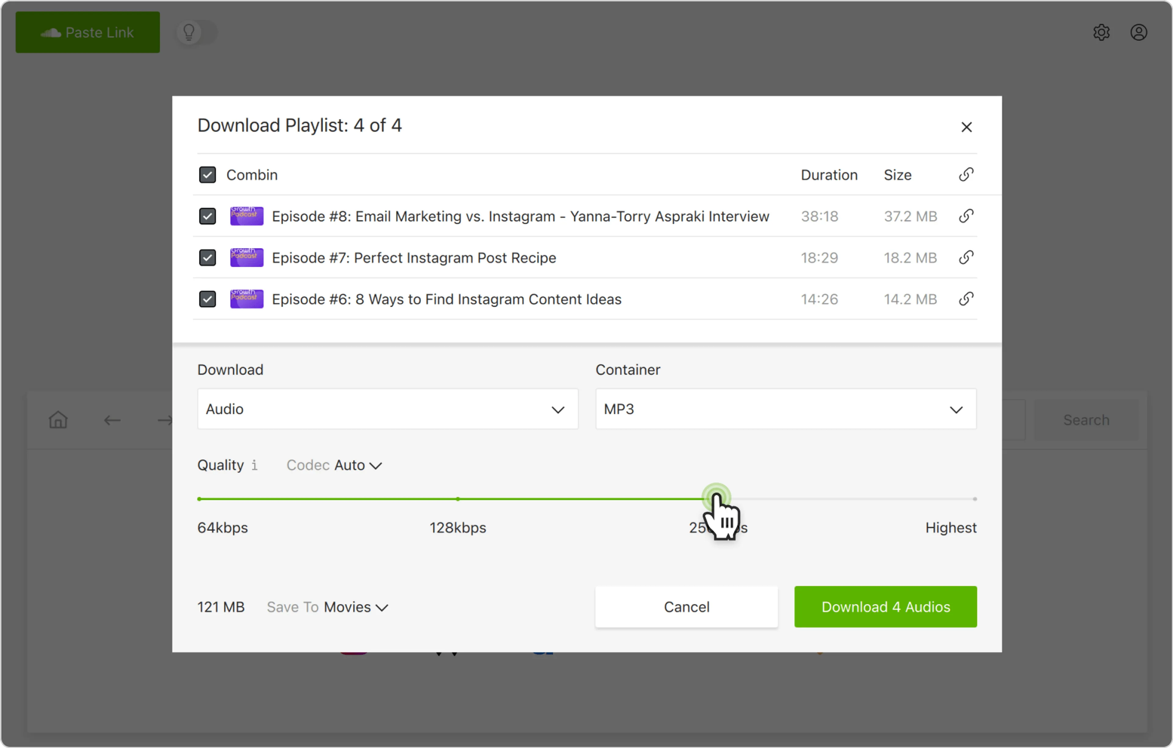4. Selecione o formato e a qualidade preferidos.