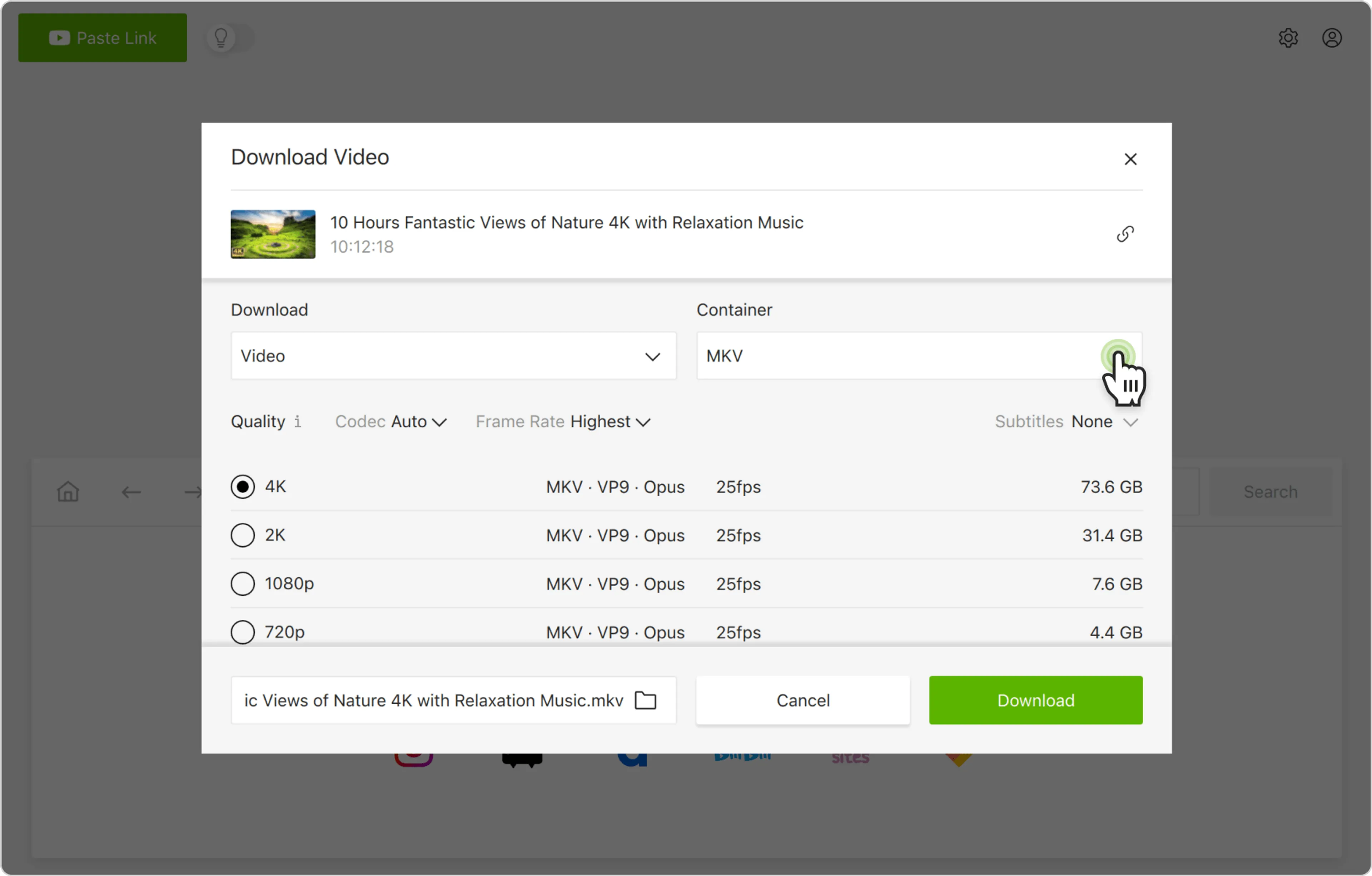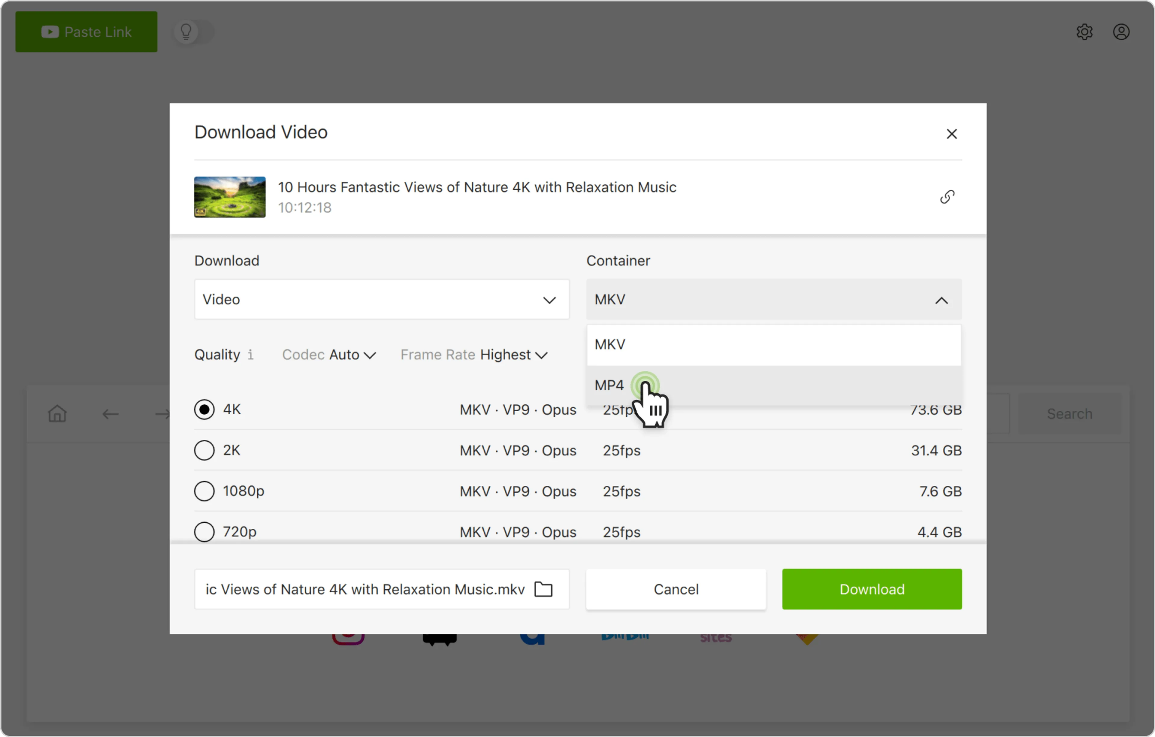 O MP4 é um formato de vídeo altamente compatível com a maioria dos reprodutores de mídia, dispositivos e sistemas operacionais. Ele usa tecnologia de compressão avançada capaz de produzir vídeos em alta qualidade com tamanhos de arquivo menores. Isso facilita o armazenamento e o compartilhamento de vídeos sem comprometer a qualidade. Se quiser baixar vídeos do YouTube em formato MP4, o 4K Video Downloader Plus é exatamente o que você necessita. Siga as etapas simples abaixo para começar o download.