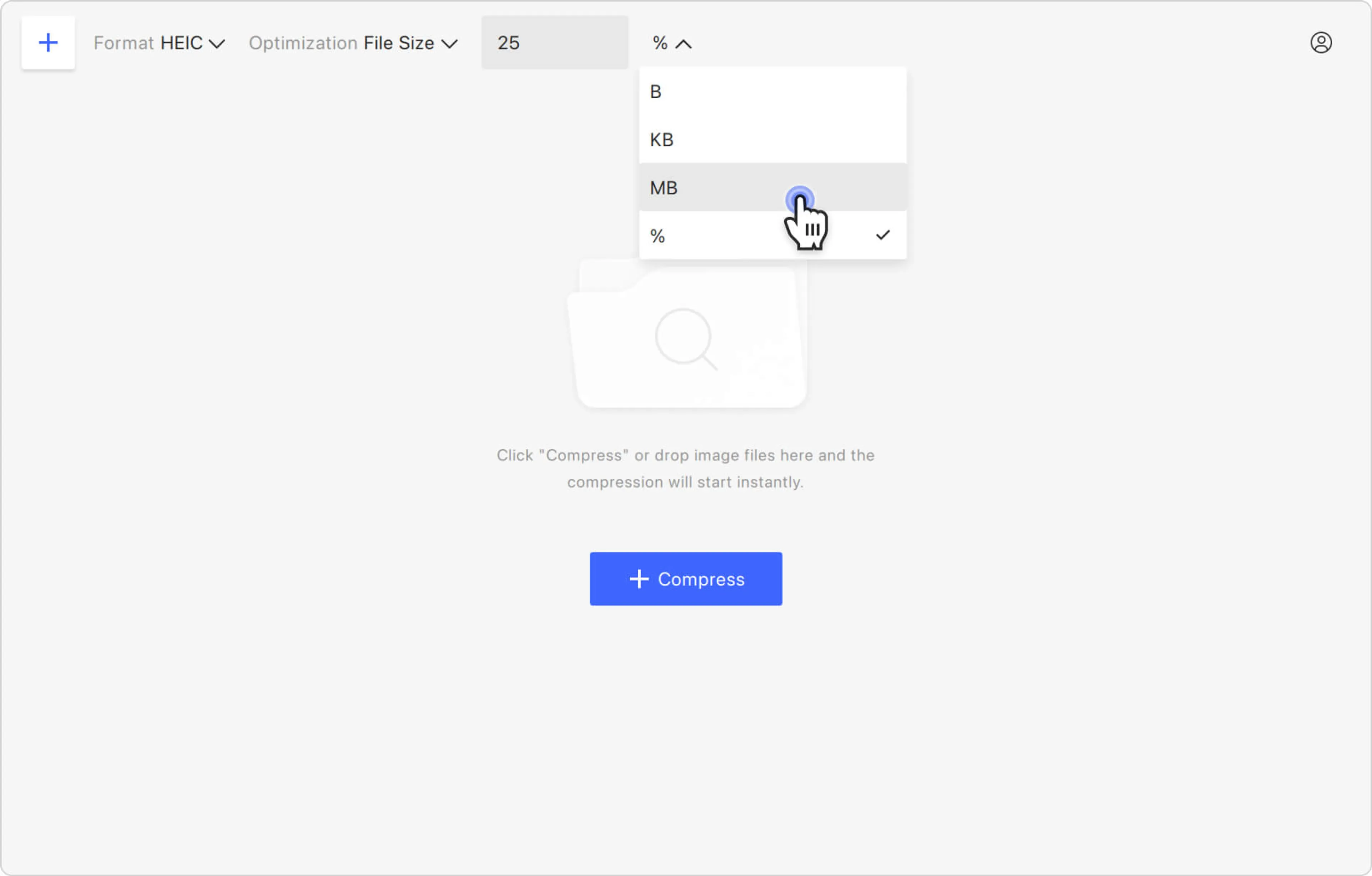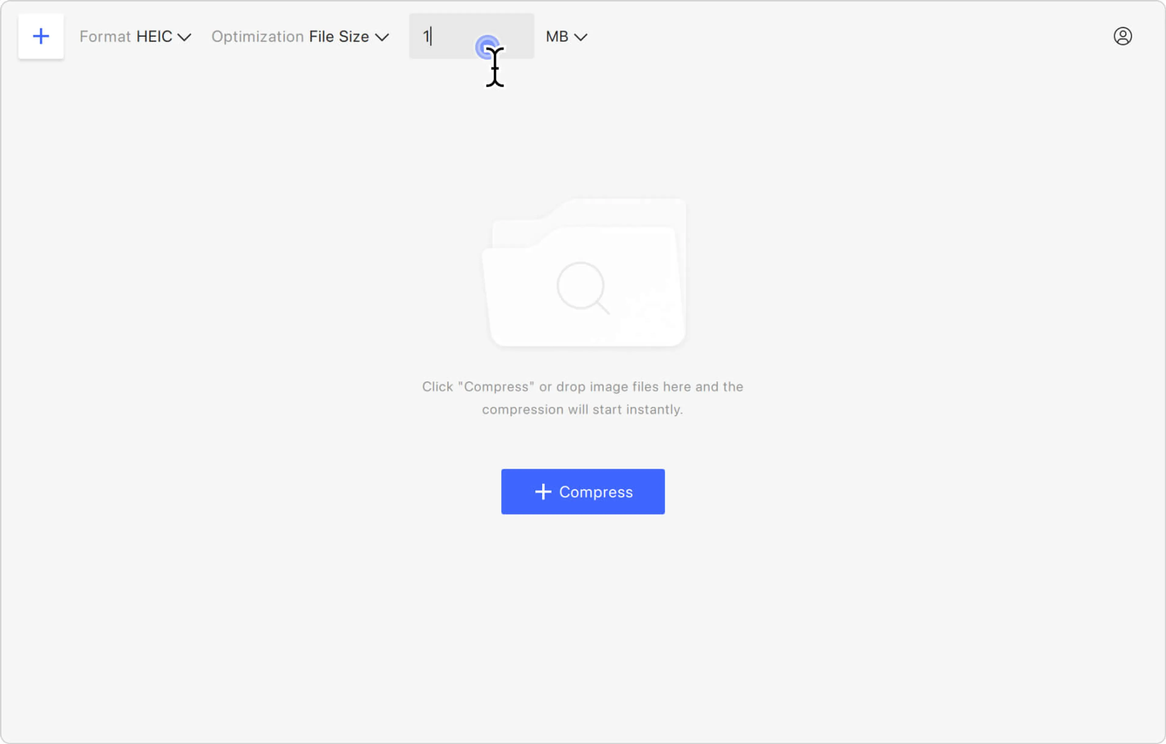 6. Carregue sua imagem. Clique no botão Compactar no meio da janela do aplicativo para selecionar o arquivo ou simplesmente arraste e solte a imagem. Seus HEIC serão imediatamente carregados e compactados.