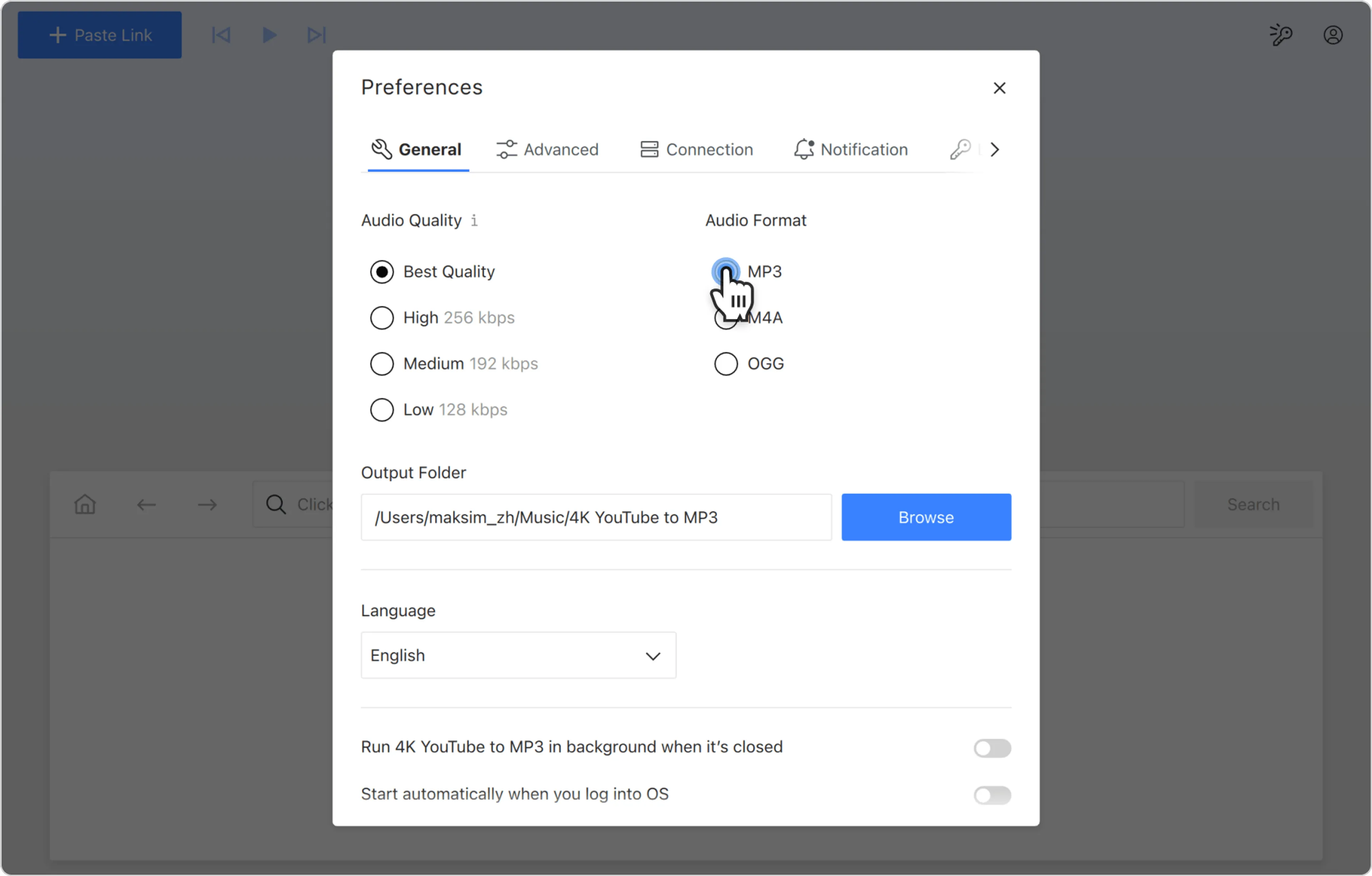 3. Selecione o formato, a qualidade e a pasta de saída. Feche a janela para salvar as preferências.